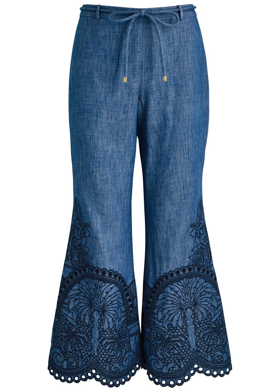 Info & Care Zimmermann chambray;trousers Designer embroidery at cuffs, belt loops, detachable waist tie, darts at back waist, eyelet-embroidered details, scalloped cuffs, faded finish, partially lined Concealed hook and zip fastening at back 100% cotton Machine wash inside out to avoid colour transfer Coordinating items available Size & Fit Inside leg length: 27.5 inches/ 70cm Midweight Relaxed fit, wide-leg cut Model is 5'11"/ 180cm and wears a size 0