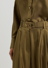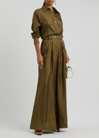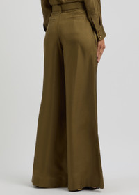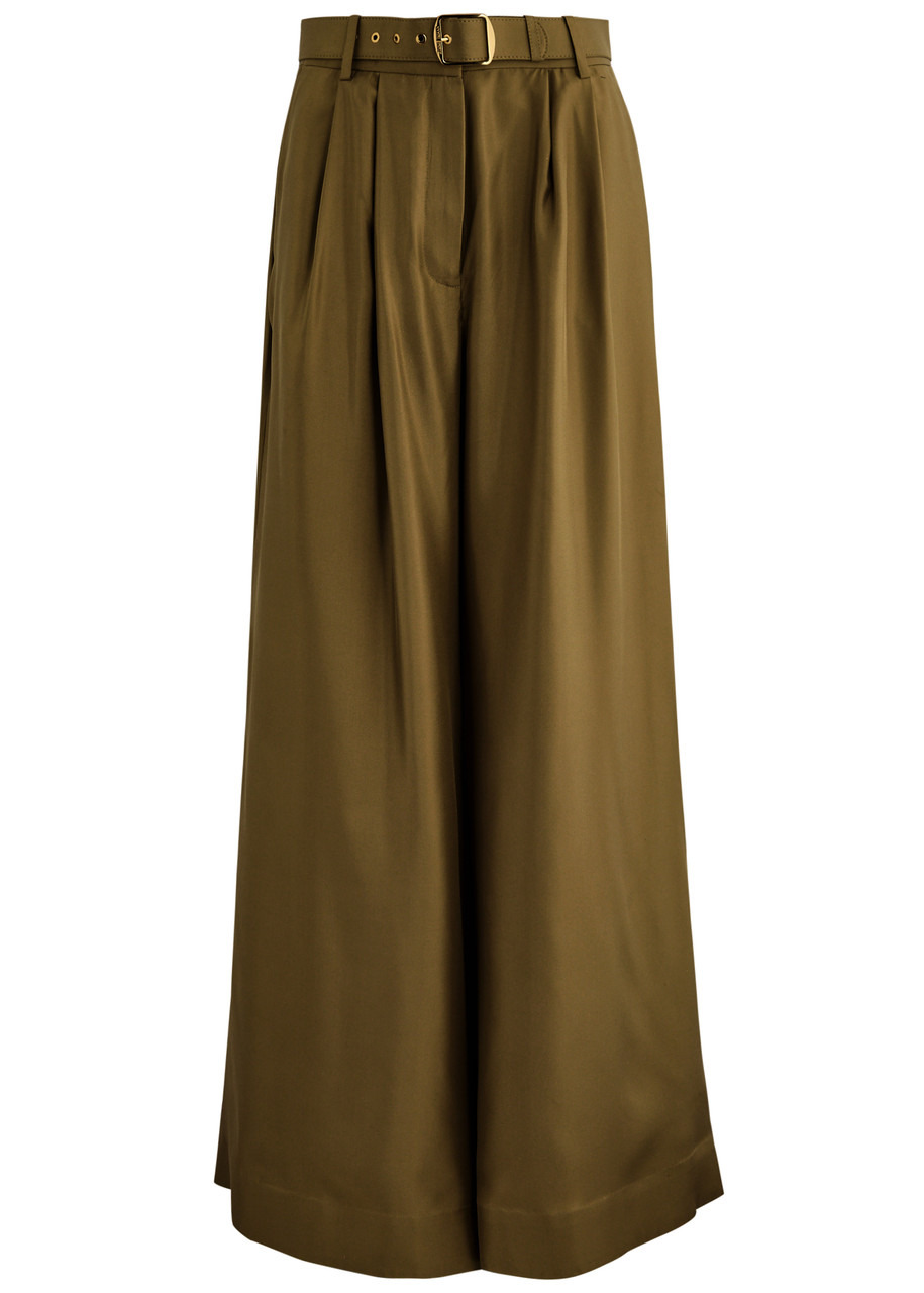 Info & Care Zimmermann silk-twill trousers Belt loops, detachable adjustable belt, pleats at waist, side slip pockets, two back slit pockets Concealed zip, hook and button fastenings at front 100% silk Dry clean Size & Fit Inside leg length: 33 inches/ 84cm Midweight Wide flared-leg cut Model is 5'9"/ 175cm and wears a size;0