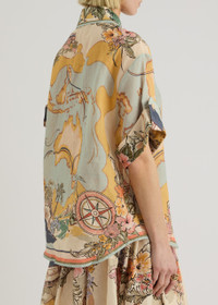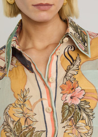 Style Notes The Crush ramie shirt from Zimmerman's Resort 25 collection is a breezy choice for your vacation wardrobe. Printed with vintage maps and tropical motifs, this loose style features short turn-up sleeves and crochet-trimmed buttons through the front. Info & Care Zimmermann ramie shirt Printed, pointed collar, dropped shoulder, turn-up cuffs with button-fastening strap, chest patch pocket, embroidery at collar and cuffs, curved hem Crochet button fastenings through front 100% ramie Dry clean Size & Fit Length shoulder to hem: 27 inches/ 68.5cm Midweight Relaxed, loose fit Model is 5'9"/ 175cm and wears a size 0