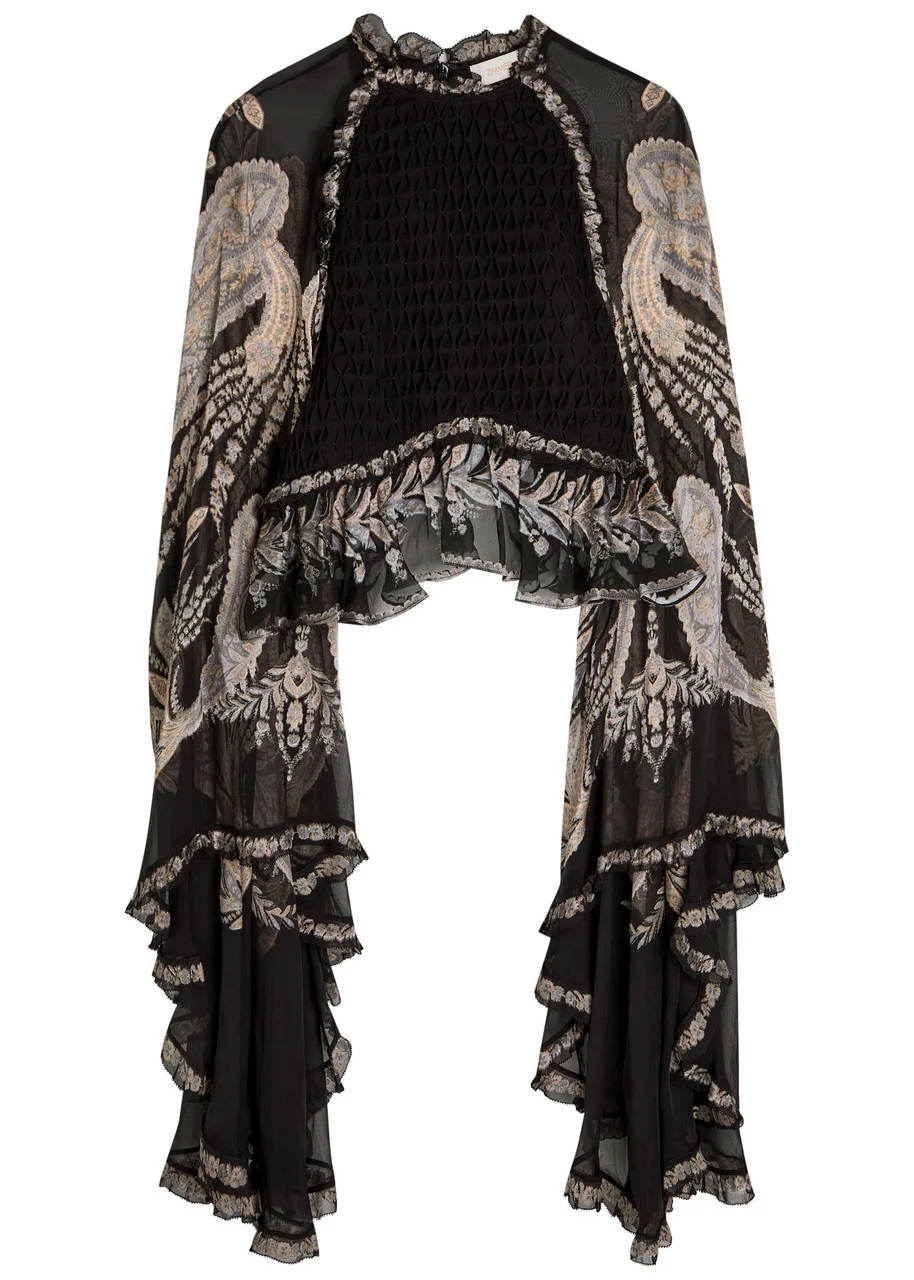 Info & Care Zimmermann silk-chiffon blouse Printed, round-neck, semi-sheer draped raglan sleeves, ruffled trims Concealed zip fastening through back Fabric 1: 100% silk; fabric 2: 76% polyester, 24% silk Dry clean Size & Fit Length shoulder to hem: 20 inches/ 50.5cm Midweight Relaxed cropped fit Model is 5'10"/ 178cm and wears a size small