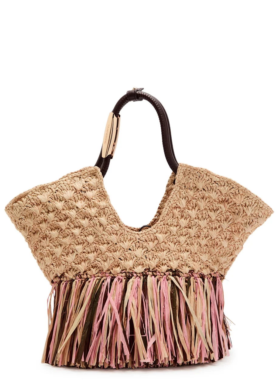 Info & Care Handwoven Zimmermann crochet raffia tote bag Two leather top handles with designer-engraved trim, detachable adjustable leather shoulder strap, stud-fastening tab top handle connector, fringed details Open top Size & Fit Width: 1: 8 inches/ 20cm; 2: 14 inches/ 35cm Height: 1: 9 inches/ 23cm; 2: 5 inches/ 12.5cm Depth: 2 inches/ 5cm Top handle drop: 7 inches/ 18cm Min. shoulder strap drop: 19/ 48.5cm Max. shoulder strap drop:;22 inches/ 56cm