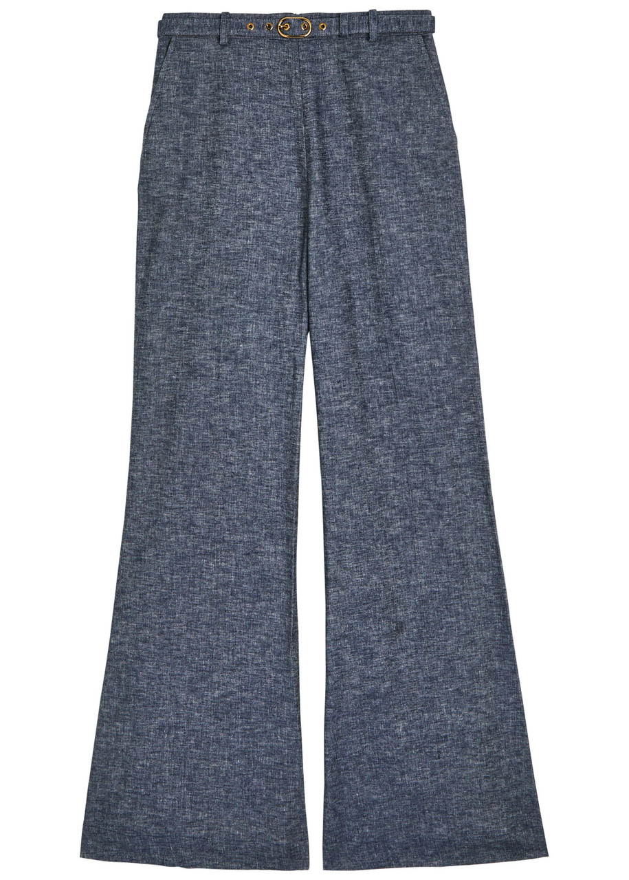 Info & Care Zimmermann;linen-blend;trousers Belt loops, detachable buckle-fastening belt, side slip pockets, pressed crease through legs Concealed zip fastening at back 51% linen, 47% cotton, 2% elastane Dry clean Size & Fit Inside leg length: 34 inches/ 86.5cm Midweight Flared-leg cut Model is 5'9"/ 175cm and wears a size 1