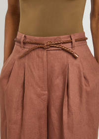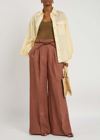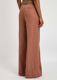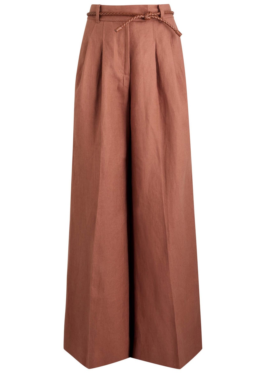 Info & Care Zimmermann linen trousers Belt loops, detachable hook-fastening knotted belt, pleats at front waist, side slip pockets, two slit pockets at back, pressed creases through legs Concealed hook and zip fastenings at front 100% linen; Dry clean Size & Fit Inside leg length: 32.5 inches/ 82.5cm Midweight Wide-leg cut, designed to sit high on the waist Model is 5'10"/ 178cm and wears a size;0