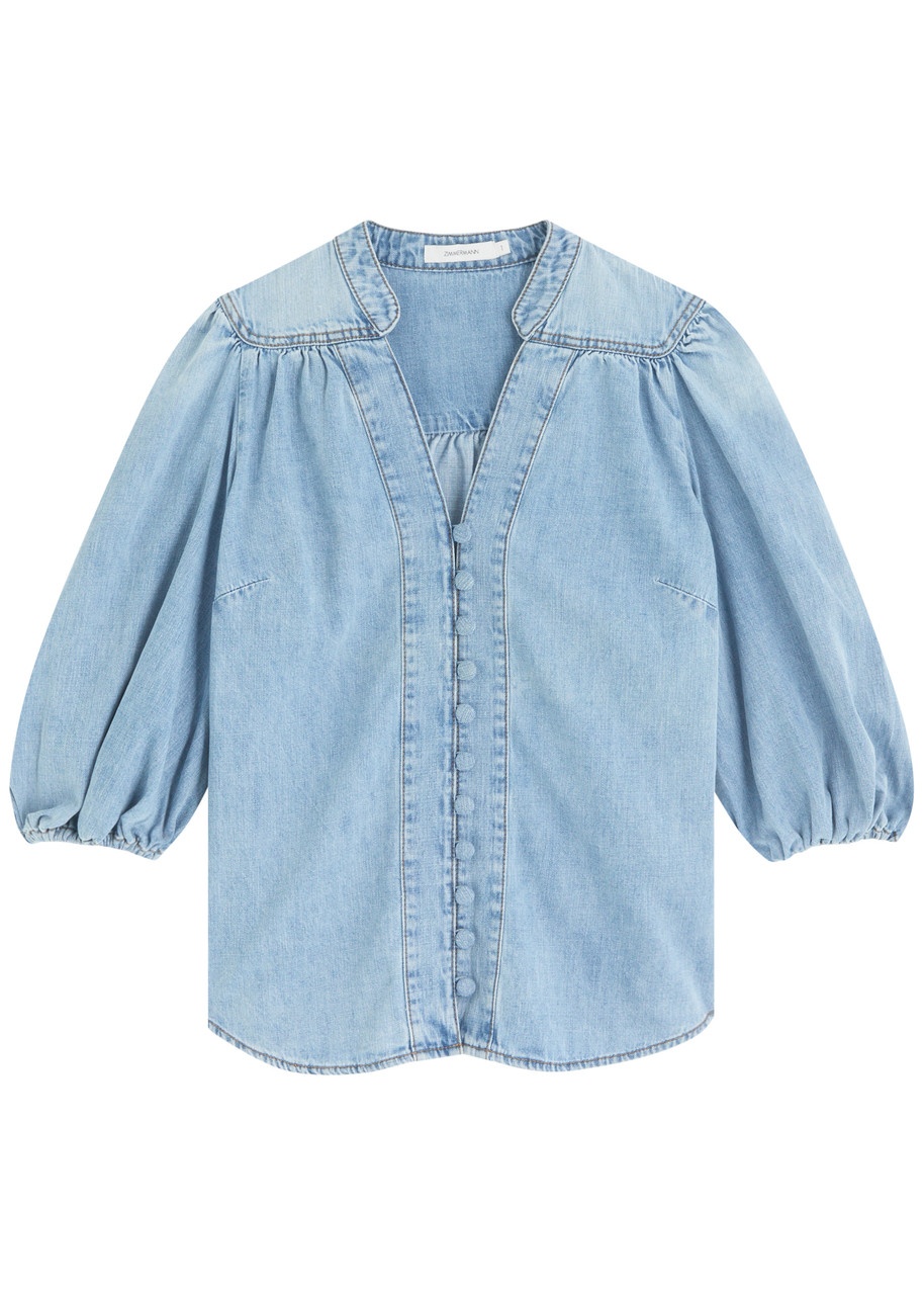 Info & Care Zimmermann denim;blouse Mandarin collar, button-fastening low V-neck,;balloon sleeves, elasticated cuffs, panelled, pleated details, curved hem, longer back hem, contrast stitching, faded finish Button fastenings through front 100%;cotton Machine wash inside out to avoid colour transfer Size & Fit Length shoulder to hem: 24 inches/ 61cm; back: 26 inches/ 66cm Midweight Relaxed fit Model is 5'10"/ 178cm and wears a size;0