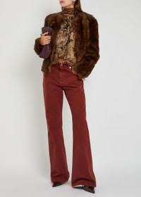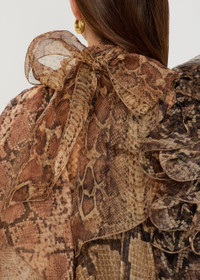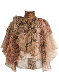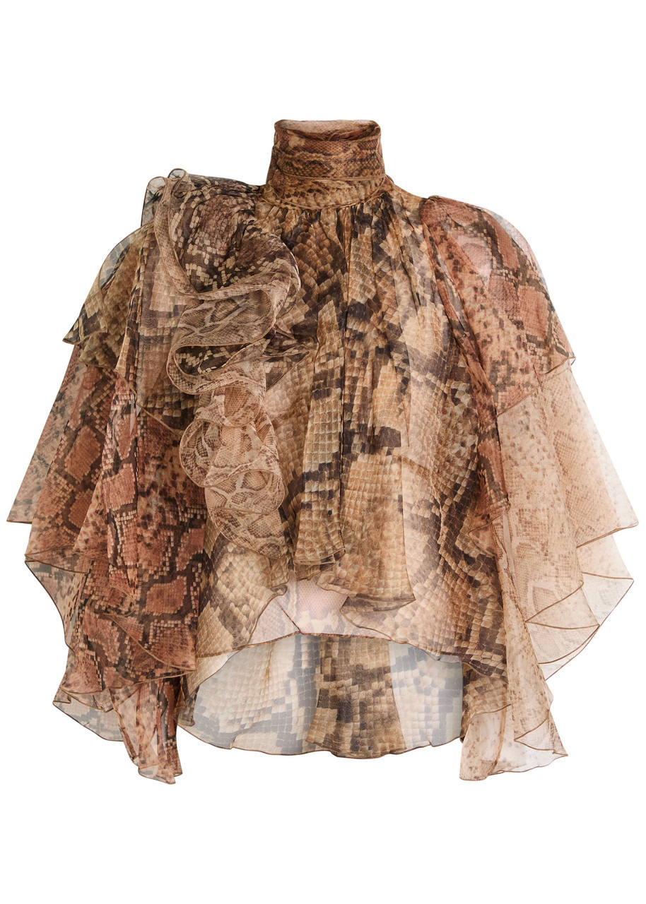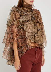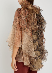Info & Care Zimmermann silk-organza blouse Python print, ties at high-neck, split tiered bell sleeves, structured ruffled panel through side, gathered details, curved hem, longer back hem, partially lined Concealed zip fastening at side and back 100% silk Dry clean Size & Fit Length shoulder to hem: front: 21 inches/ 53.5cm; back: 29 inches/ 74cm Midweight Slim fit bodice, loose overlay Model is 5'9"/ 175cm and wears a size;1