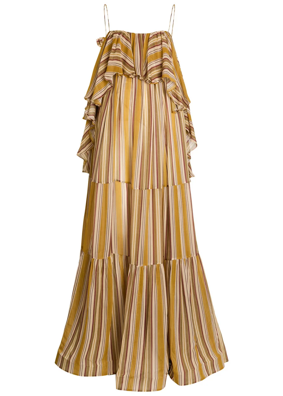 Info & Care Zimmermann chiffon dress Striped, square-neck, adjustable tie-fastening shoulder straps, cascading ruffle overlay, tiered, partially lined Concealed zip fastening at back 100% viscose Dry clean Size & Fit Length shoulder to hem: 60 inches/ 152.5cm Midweight Loose fit Model is 5'10"/ 178cm and wears a size;0