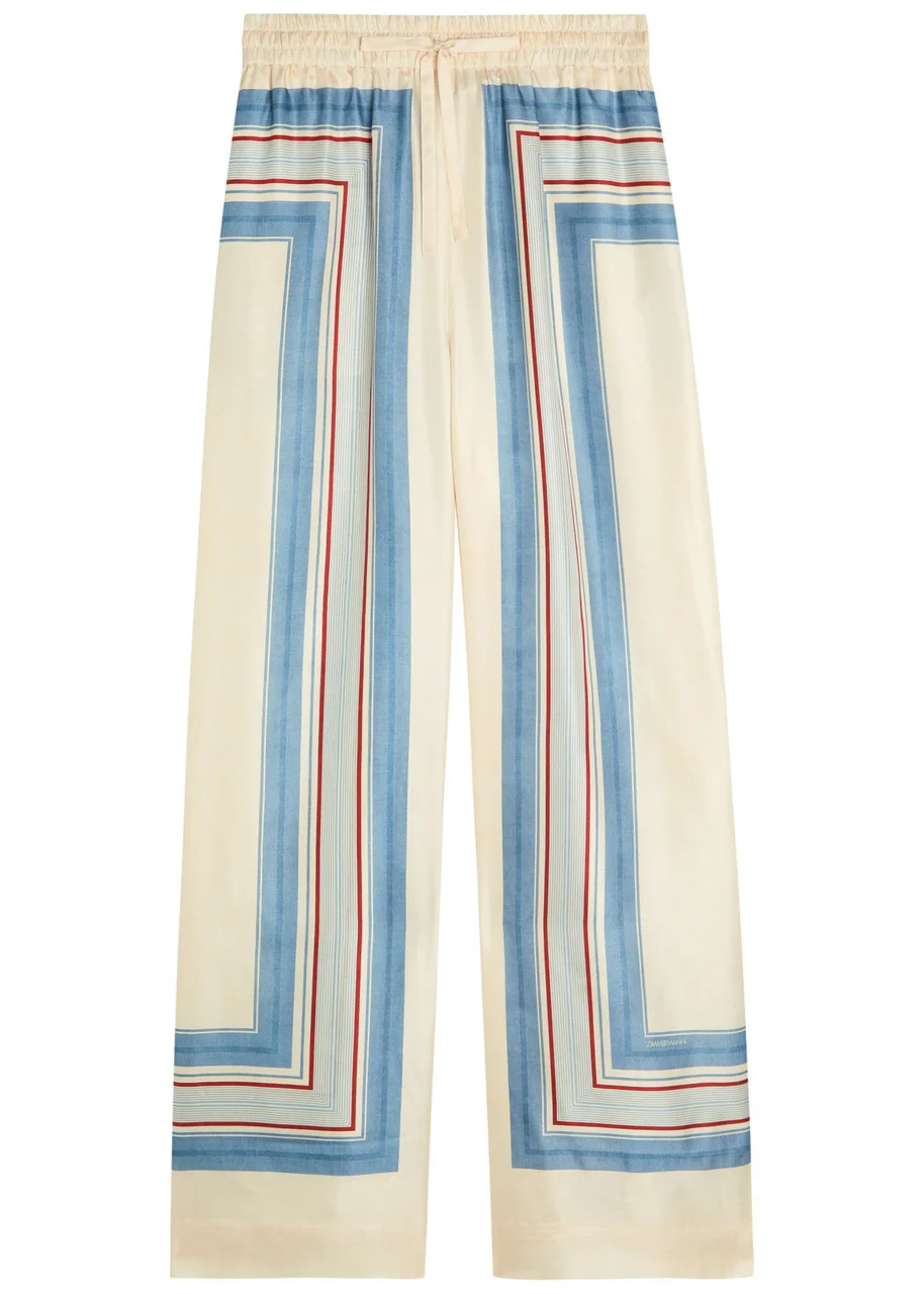 Info & Care Zimmermann silk trousers Patterned, elasticated drawstring waistband, side slip pockets Pull on 100% silk Dry clean Coordinating items available Size & Fit Inside leg length: 31 inches/ 79cm Midweight High-rise fit, loose wide-leg cut Model is 5'10"/ 178cm and wears a size 0