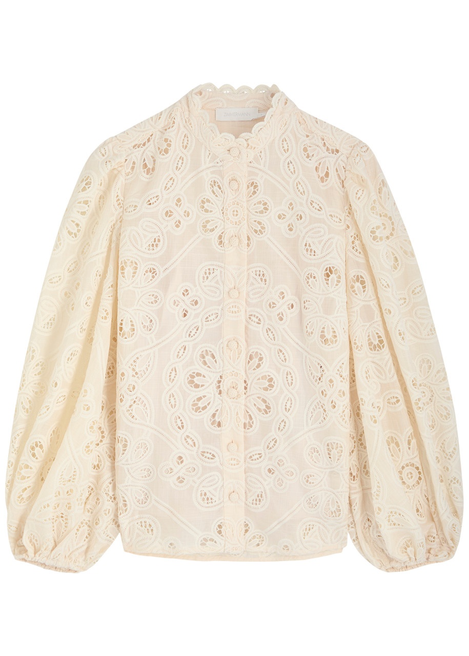 Info & Care Zimmermann cotton blouse Open embroidery, stand collar with embroidered scalloped trims, puffed balloon sleeves, elasticated cuffs, box pleat at back, curved hem, longer back hem, camisole lining Crochet button fastenings through front 100% cotton; lining: 86% recycled polyester, 14% elastane Dry clean Coordinating items available Size & Fit Length shoulder to hem: 22 inches/ 56cm; back: 26 inches/ 66cm Midweight Relaxed fit Model is 5'11"/ 180cm and wears a size 0