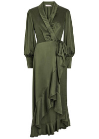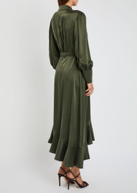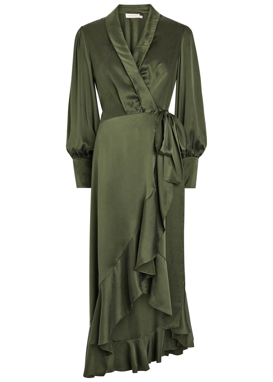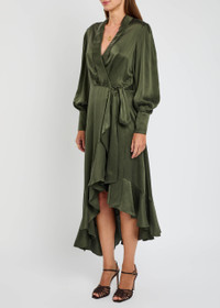Info & Care Zimmermann silk-satin wrap dress V-neck, balloon sleeves, zip-fastening cuffs, gathered details, ruffled curved hem, longer back hem Tie fastening at wrap front 100% silk Dry clean Size & Fit Length shoulder to hem: 40 inches/ 102cm; 2: 51.5 inches/ 131cm Midweight Loose;fit, use tie to cinch the waist Model is 5'8"/ 172cm and wears a size 1