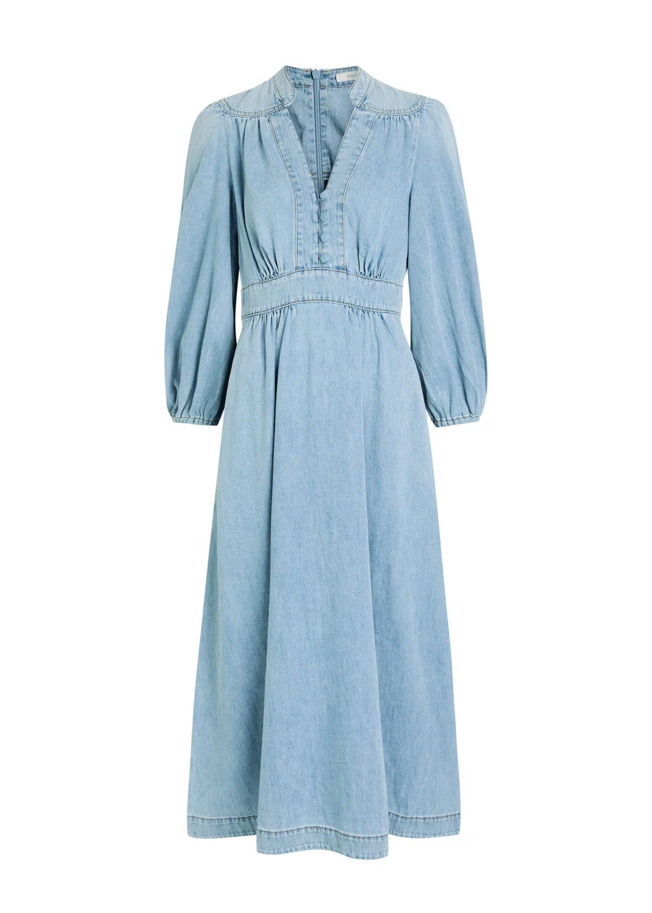 Info & Care Zimmermann denim dress Stand collar, button-fastening V-neck,;balloon sleeves, elasticated cuffs, side slip pockets, pleated details, contrast stitching, faded finish; Concealed zip fastening at back 100% cotton Machine wash inside out to avoid colour transfer Size & Fit Length shoulder to hem: 50 inches/ 127cm Midweight Relaxed fit, fitted at the waist A-line cut Model is 5'10"/ 178cm and wears a size;0