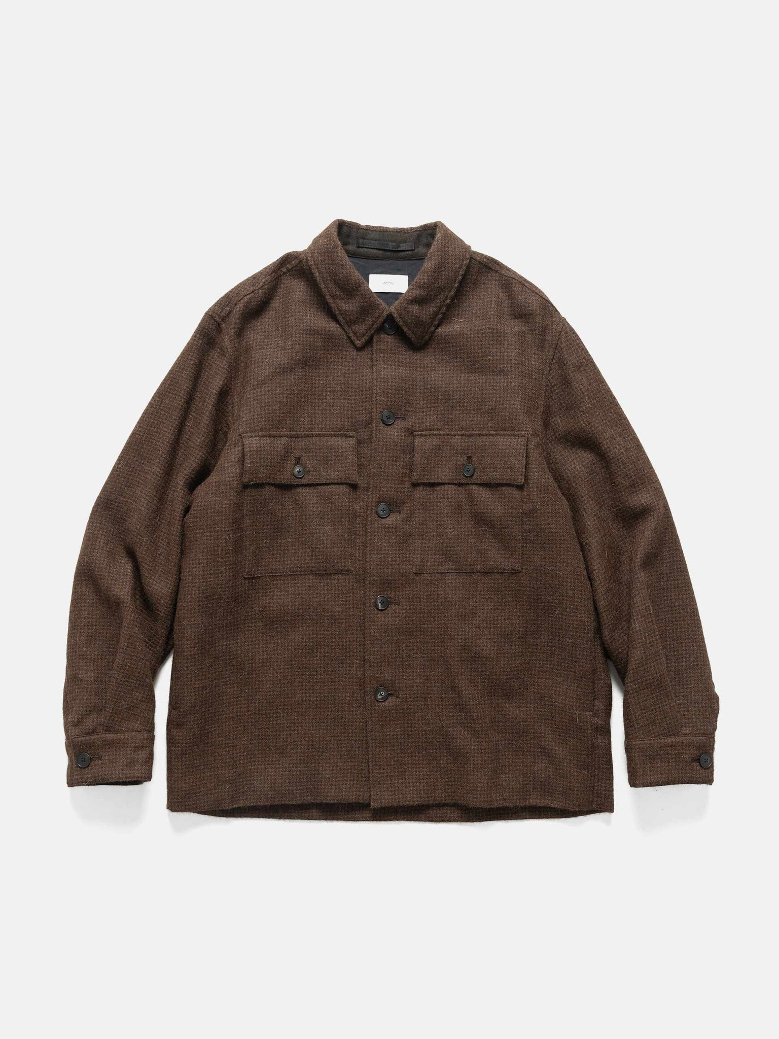 The ATON CPO Jacket Alpaca Hound Tooth reinterprets a classic military CPO shirt with an oversized silhouette and refined materials. Crafted in Ichinomiya City from superfine alpaca yarn, the houndstooth fabric is slowly felted to preserve its natural luster while creating a firm, full hand and soft comfort. A high-density nylon taffeta lining keeps the piece lightweight and easy to layer, enhancing its bold yet versatile shape. Balancing heritage inspiration with luxurious texture, it’s a versatile yet subtle standout piece for the season. DETAILS - JKAGGW0905 - Body: 100% Alpaca - Lining: 100% Nylon - ATON original fabric - Relaxed fit - Set in sleeve construction - Button closure - Large button flap closure chest patch pockets - Button cuffs - Made in Japan
