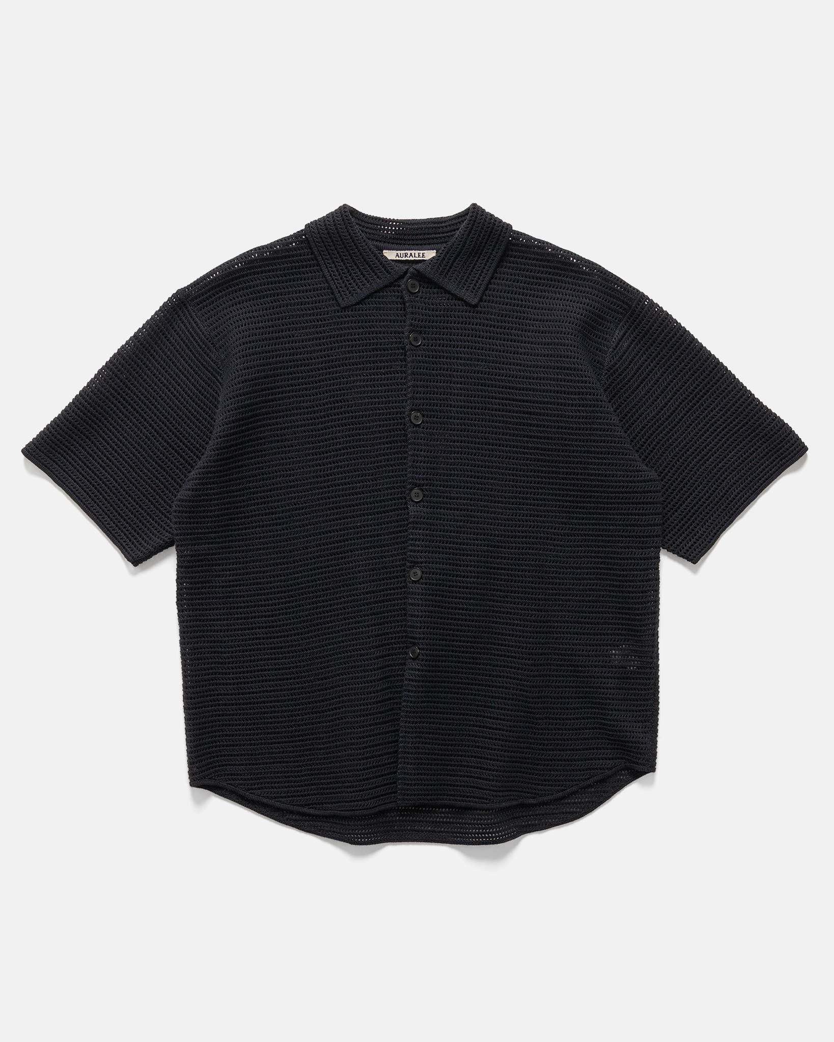 The Auralee Cotton Mesh Knit Half Sleeved Shirt delivers breathable structure with a unique texture and presence. Designed for comfort in warmer weather, its relaxed silhouette is knit from a cotton yarn processed to mimic linen, offering a lightweight yet sturdy feel. The twisted mesh knit construction gives it an elevated, open-weave look that layers easily while maintaining shape. DETAILS - A25SS01KB - 100% cotton - Twisted cotton mesh knit - Konjac processing - Relaxed fit - Standard collar - Button front closure - Dropped shoulders - Set-in sleeves - Curved hem - Crochet-inspired structure - Made in Japan
