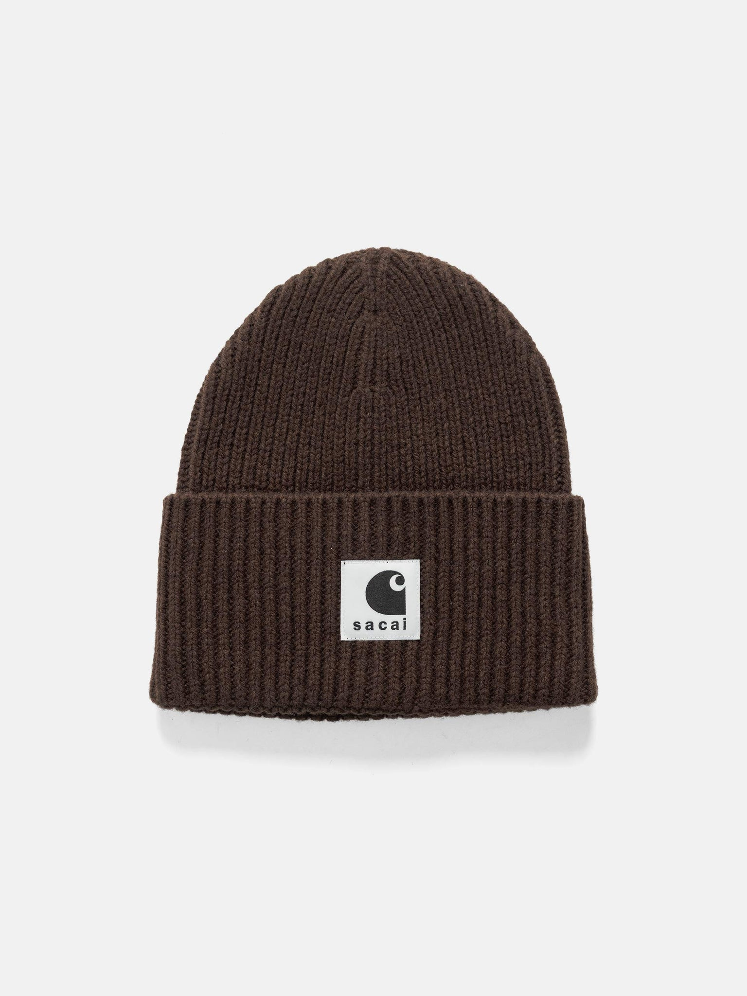 The sacai x Carhartt WIP Wool Knit Beanie is made from spun wool and nylon yarn with a rib-knit, half-cardigan structure, where one side of the fabric uses tuck stitches for thickness, and the other side features a standard knit. A co-branded woven label appears on the cuff. DETAILS - #25-00997S - 80% Wool, 20% Nylon - Rib knit construction - Co-branded woven label - Made in Japan