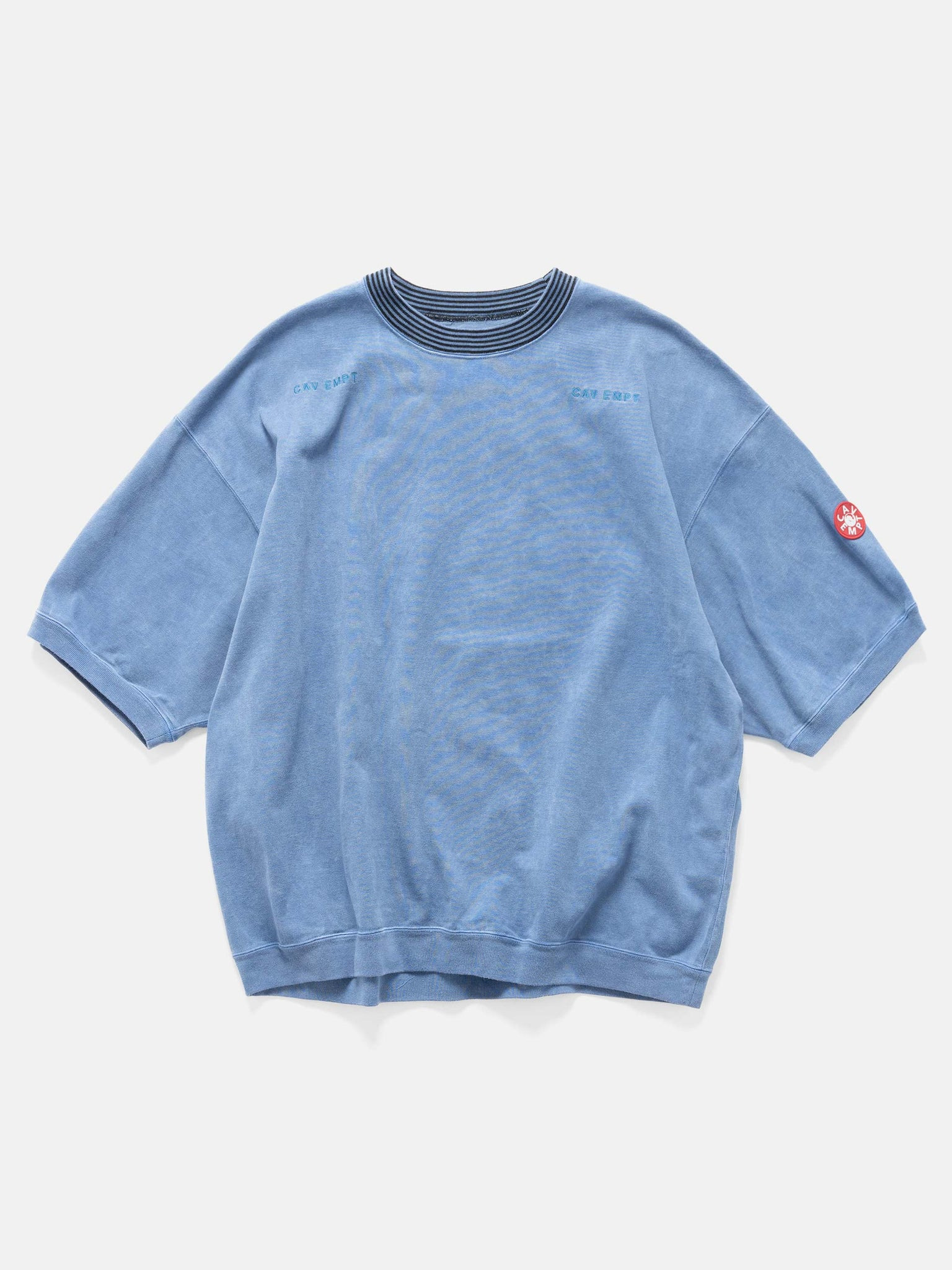 This short-sleeve crew from Cav Empt reimagines the classic sweatshirt with bold detailing and a distinctive overdye finish. Crafted in Japan from heavyweight cotton jersey, it features set-in sleeves, striped ribbing at the collar, and a wide, relaxed fit. Signature accents include embroidered branding at the shoulder, a silicone sleeve patch, and reflective prints, with a tonal fabric patch at the back adding texture and depth. DETAILS - CES28CS25 - 100% Cotton - Wide, relaxed fit - Crewneck - Drop shoulder construction - Set in sleeves - Straight hem - Rubber brand patch on sleeve - Embroidered branding at chest - Back ziggurat patch - Ribbed collar, cuffs and hem - Made in Japan