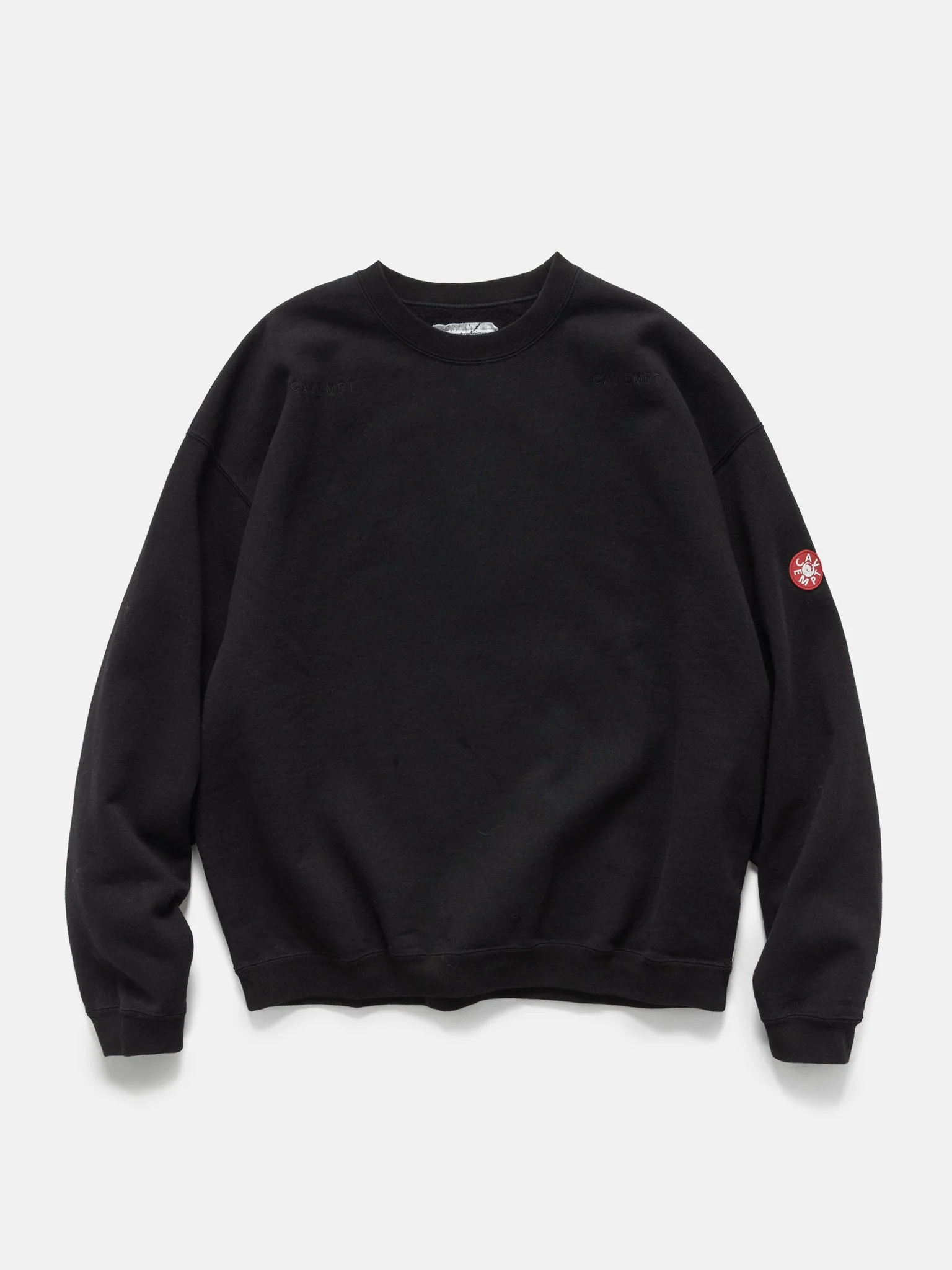 The CAV EMPT Solid Loose Crew Neck refines a familiar staple through proportion and quiet graphic detail. Cut in a short, boxy silhouette with dropped shoulders, it offers a relaxed drape while maintaining structure. The heavyweight cotton construction provides warmth and durability for everyday wear. Finished with reflective piping forming the brand’s signature ziggurat and tonal branding, it balances comfort with understated utility. DETAILS - CES28CS12 - 100% Cotton - Short, boxy fit - Dropped shoulder construction - Embroidered motif at front shoulders - Ribbed collar, cuffs and hem - Piping seams on sleeves - Ziggurat seam at back with internal patch - CE logo patch on left sleeve - Made in Japan