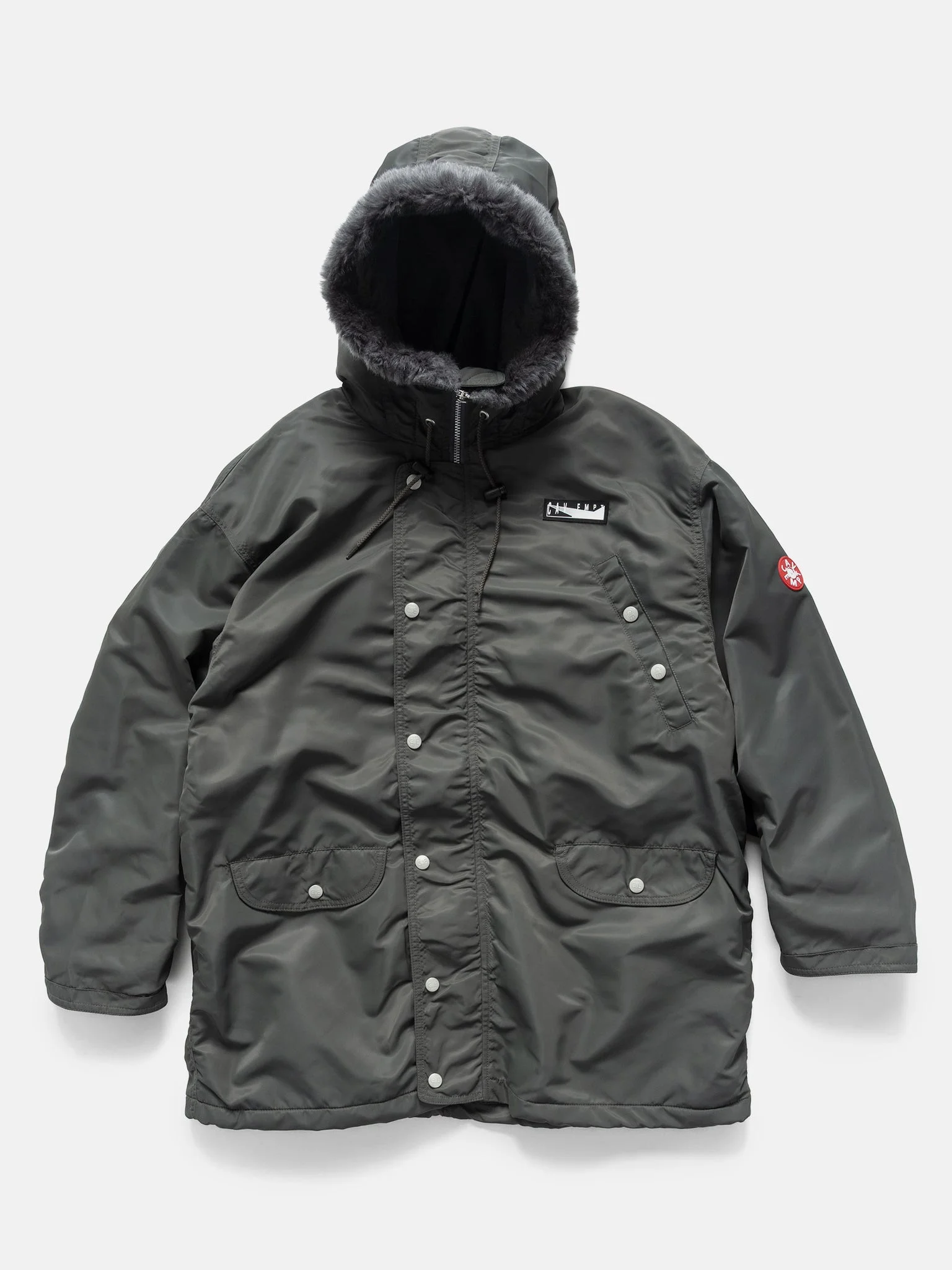 The CAV EMPT Synth Fur Hood Zip Coat blends cold-weather military references with the brand’s restrained, graphic approach. Built with a water-resistant shell and warm fleece lining, it offers reliable protection in a clean, contemporary form. The wide silhouette is balanced by functional detailing, including a drawstring hood and hem, ribbed cuffs, and generous pocketing. Finished with a synthetic fur hood and subtle rubber patch graphics, it’s a versatile outer layer focussed on utility and modern design. DETAILS - CES28JK06 - Body: 100% Nylon - Lining: 100% Polyester - Pile: 70% Modacrylic, 30% Acrylic - Base Fabric: 100% Polyester - Rib: 48% Cotton, 48% Polyester, 3% Nylon, 1% Polyurethane - Wide fit - High neck collar - Adjustable drawstring hood with fur trim - Zip closure with snap placket - Flap and snap closure hand pockets - Snap closure chest pocket - Ribbed cuffs - Drawcord adjustable hem and waist - Rubber branded sleeve and chest badges - Made in Japan