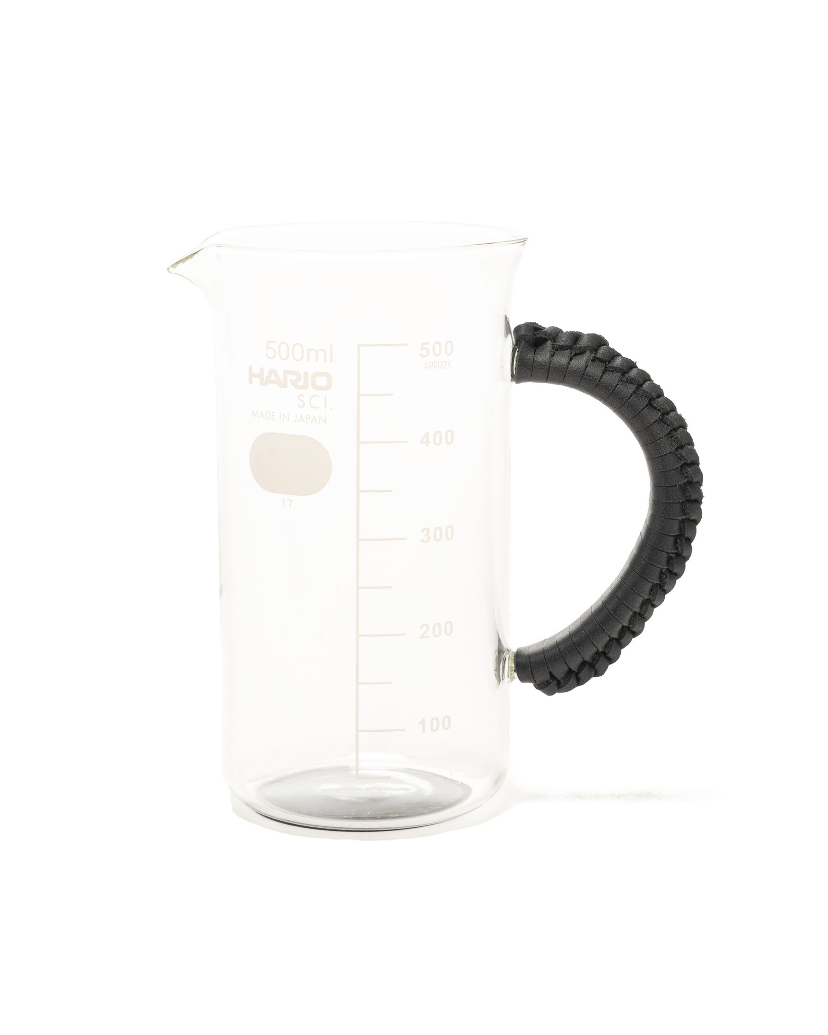 A uniwue and visually appealing display vessel perfect for any home setting to cast a gentle mood. Utilizing a classic cylindrical beaker, usually found in kitchens or labs, made by renowned glassmaker HARIO. The vase carries a contemporary and rustic look, with its handle encased by a meticulously cut and woven leather wrap that will naturally patina with age. DETAILS - SV-HB-500 - Vegetable tanned cowhide leather - Borosilicate glass - Hand cut and woven leather handle cover - Leather base - 500ml capacity - Made in Japan
