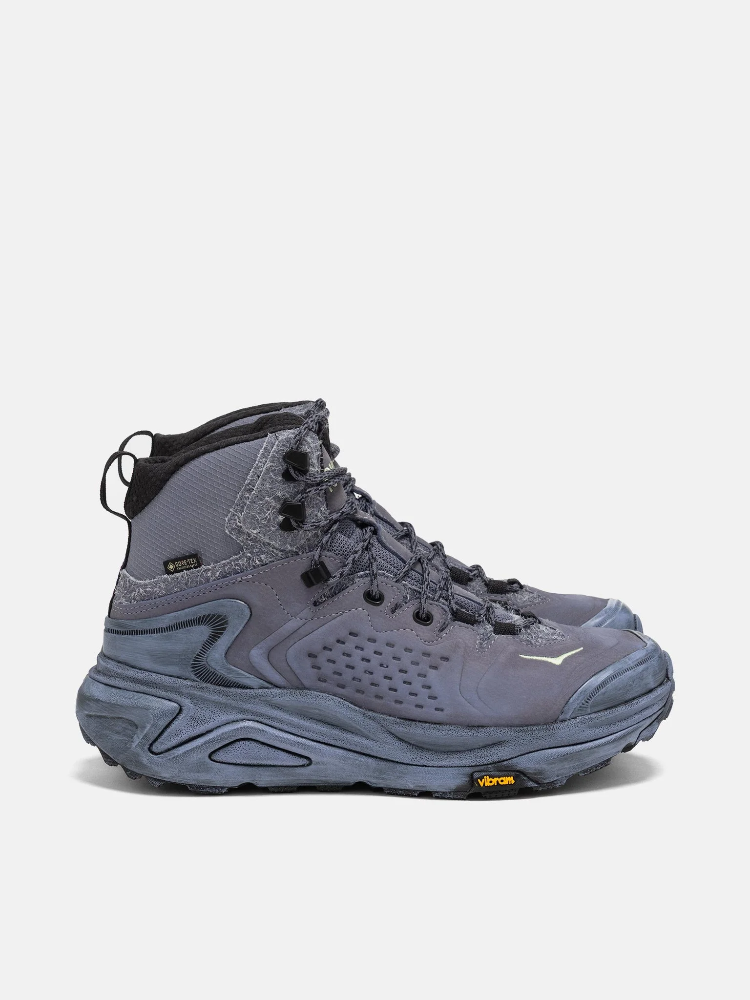 The HOKA Kaha 3 GTX TP blends trail-ready durability with a distressed, adventure-worn aesthetic. Its mid-cut silhouette and GORE-TEX Invisible Fit keep feet dry, while a cushioned sockliner and dual-density sugarcane EVA midsole reduce fatigue and add responsive bounce for long days on the trail. Designed for multi-day adventures, the Kaha 3 GTX offers a protective toe cap, an Achilles-friendly heel, and a Vibram® Megagrip outsole for confident traction on loose and uneven terrain. Rugged yet comfortable, it’s a long-haul hiker built for exploration. DETAILS - 1168950-GHY - Two-tone hairy suede and nubuck upper - GORE-TEX Invisible Fit waterproof technology - Ripstop collar - Distressed midsole paint treatment - Hubble® Heel and SwallowTail™ design - Dual-density midsole - Oversize EVA foam midsole - MetaRocker™ with integrated flex grooves - Quick-lace metal top hooks - One-piece Vibram® Megagrip with Traction Lug and 4mm lugs