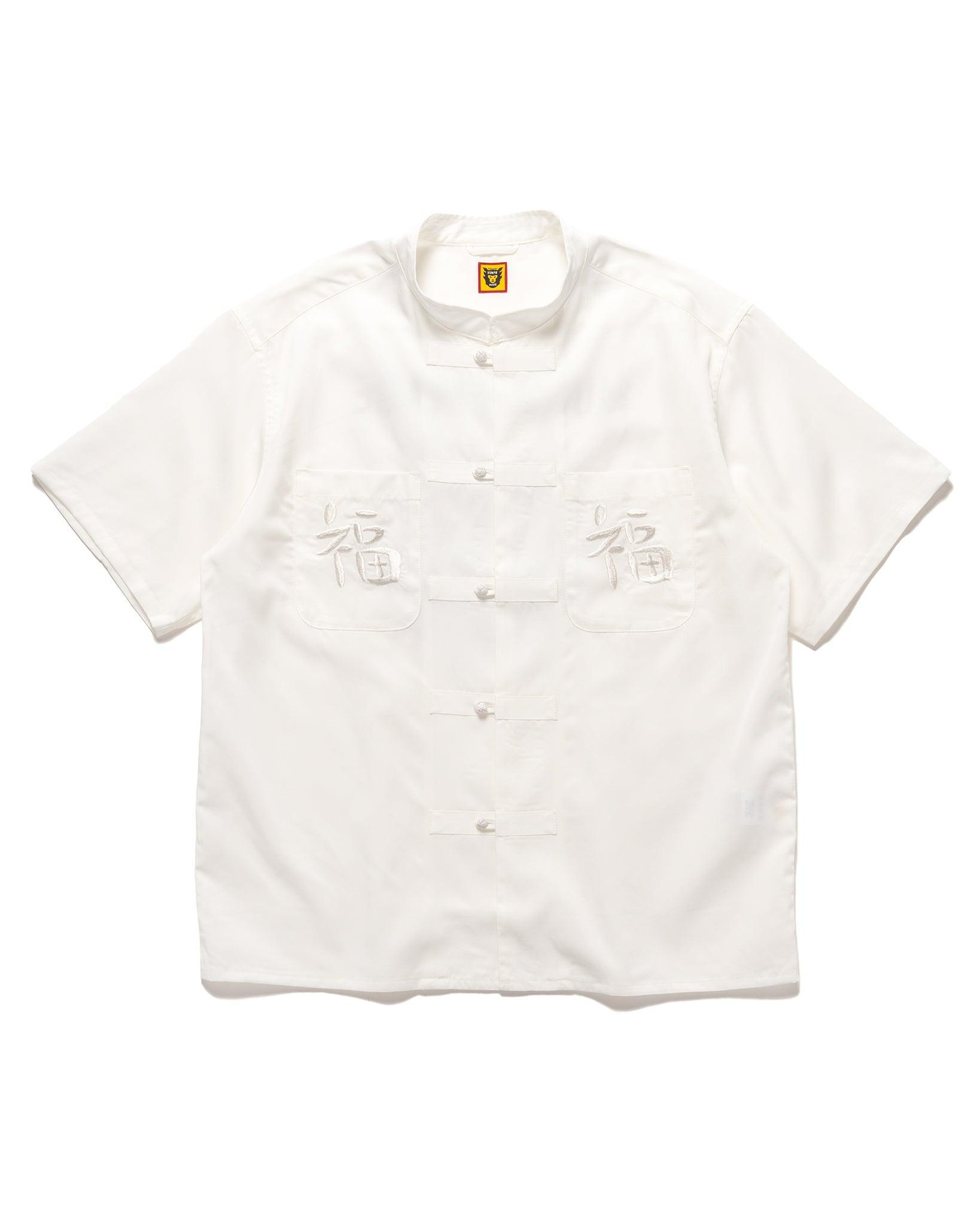 A summery take on the classic China shirt with a luxurious lyocell construction complimenting the traditional Mandarin collar and frog button fastening. A simple piece with subtle detailing, the sheen of the fabric is complimented by the tonal execution. The traditional shirt is modernised with the playful embroidery typical of Human Made. DETAILS - HM27SH017 - 68% Lyocell, 32% Cotton - Relaxed fit - Mandarin collar - Frog button closure - Patch chest pockets - Embroidered designs at chest and back - Made in Japan