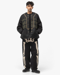 Fusing bold design with unmatched comfort, the KAPITAL BONE Boa Fleece Easy Pants are a standout piece. Crafted from soft paneled fleece, these trousers feature a striking bone graphic jacquard knit for a distinctive edge. An elasticated waist with an adjustable drawcord ensures an effortless fit, while zippered pockets provide secure storage. Wide legs and elasticated cuffs enhance the relaxed, baggy silhouette, blending bold style and comfort for everyday wear. DETAILS - K2412LP147 - Front: 100% Polyester - Lining: 100% Polyester - Detailing #1: 100% Nylon - Detailing #2: 75% Polyester, 25% Rayon - Other: 60% Cotton, 40% Nylon - Baggy fit - Wide legs - Paneled fleece construction - Elastic waistband - Adjustble drawstring - Zip hand pockets - Back zip pocket - Elasticated cuffs - Made in Japan