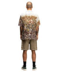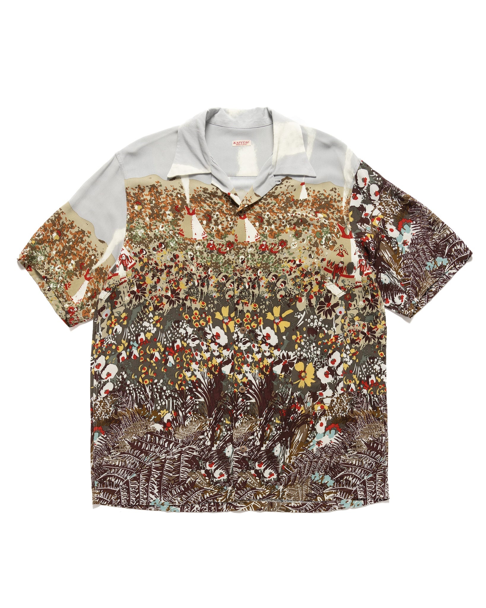 Vintage inspired shirt in a custom patterned rayon fabric. Features a boxy fit with spread collar and patch pocket at the left side-body. Made in Japan. DETAILS - K2305SS168 - 100% rayon - Custom print throughout - Spread collar - Pocket at left side body - Button front closure - Made in Japan