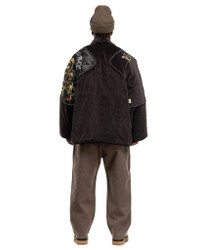 A remarkable robe jacket showcasing a completely original two-in-one transformable design. The vintage look is inspired by military souvenir jackets, notable for their decorative embroidered artwork, and is modernized into the form of a Japanese Noragi style with an effortlessly draped fit. Lightly filled with synthetic insulation, the garment can transform into a pillow thanks to meticulously placed zipper fastenings, allowing the piece to act as a unique travel companion or talking piece for a home setting. Finished with a quilted satin lining for incredible smoothness and comfort when worn. Made in Japan. DETAILS - K2210LJ079 - 100% Cotton - Velvet textured face - Relaxed fit - Raglan sleeves - Shoulder adornments with embroidered detail - Welt handwarmer pockets - Quilted lining - Insulated - Transformable into a pillow - Made in Japan