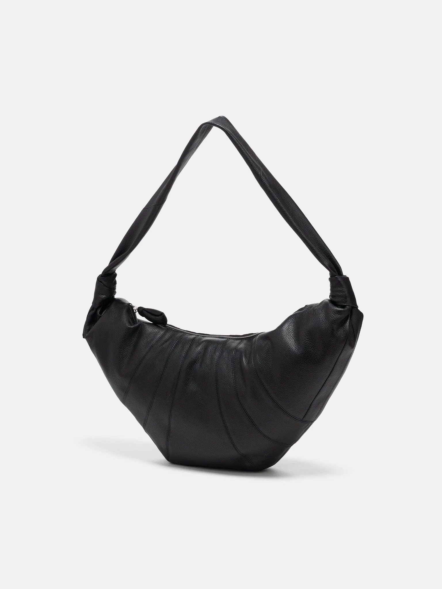 An iconic LEMAIRE design, the Croissant Bag offers a sculptural yet practical design that transitions seamlessly from daily use to travel. Its curved silhouette, inspired by the French pastry, is formed from topstitched panels and knotted details that give it both softness and structure. Crafted from supple grained leather, it balances durability with a natural texture that develops character over time. Spacious and versatile, it can be carried by hand, over the shoulder, or crossbody, making it a refined companion for everyday wear. DETAILS - BG0000 LL0018 - Body: 100% Cow Leather - Lining: 100% Cotton - Hand, shoulder or cross-body - Soft model with stitched panels - Strap with knot-style details - Zippered side pocket with quilted pull tab - Zippered opening with quilted pull tab - Interior card pocket - Interior removable zippered pouch - LEMAIRE embossed interior leather label - Silver-plated metalwork - Made in Spain