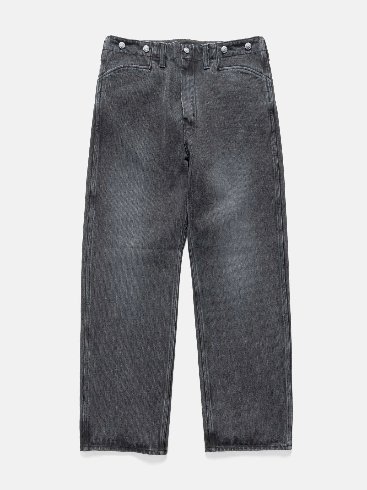 The Needles Frisco Pant refines classic workwear with a clean, modern silhouette. Cut wide and straight without a waistband, it wears easy while maintaining a structured drape. Crafted from rugged heavy twill and heavily washed, the fabric develops rich texture and a naturally worn-in feel. Finished with L-shaped pockets and signature papillon snap buttons, it balances utility with understated character. DETAILS - RW214 - 100% Cotton - Heavy wash treatment - Wide, straight fit - Custom 'Papillon' snaps throughout - L-shaped hand pockets - Waist buttons - Slanted hand pockets - Made in Japan
