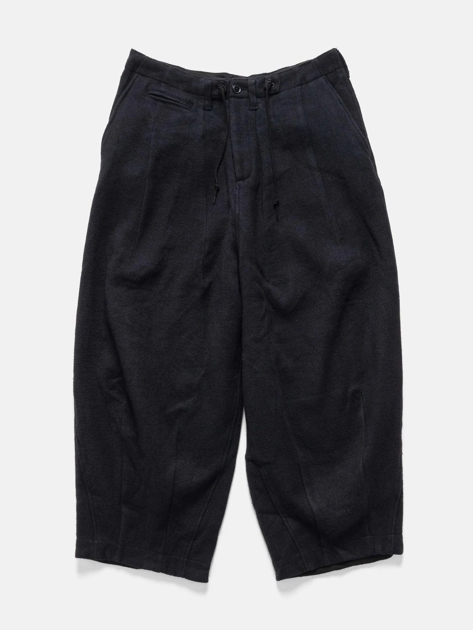 The Needles H.D. Military Pant reworks the classic military chino through the brand’s signature exaggerated silhouette. Sculpted with darts at the waist and hem, the voluminous shape offers comfort and movement while maintaining a clean, balanced profile. Cut from a refined double-face kersey blend of linen, wool, cashmere, and cotton, the fabric feels warm yet airy with subtle texture. A bold shape grounded by elegant material, designed to stand out without excess. DETAILS - RW152 - 53% Linen, 41% Wool, 4% Cashmere, 2% Cotton - Relaxed, wide fit - Darted construction - Adjustable drawstring waist - Adjustable drawstring hems - Slanted hand pockets - Back welt pockets - Coin pocket at waist - Made in Japan