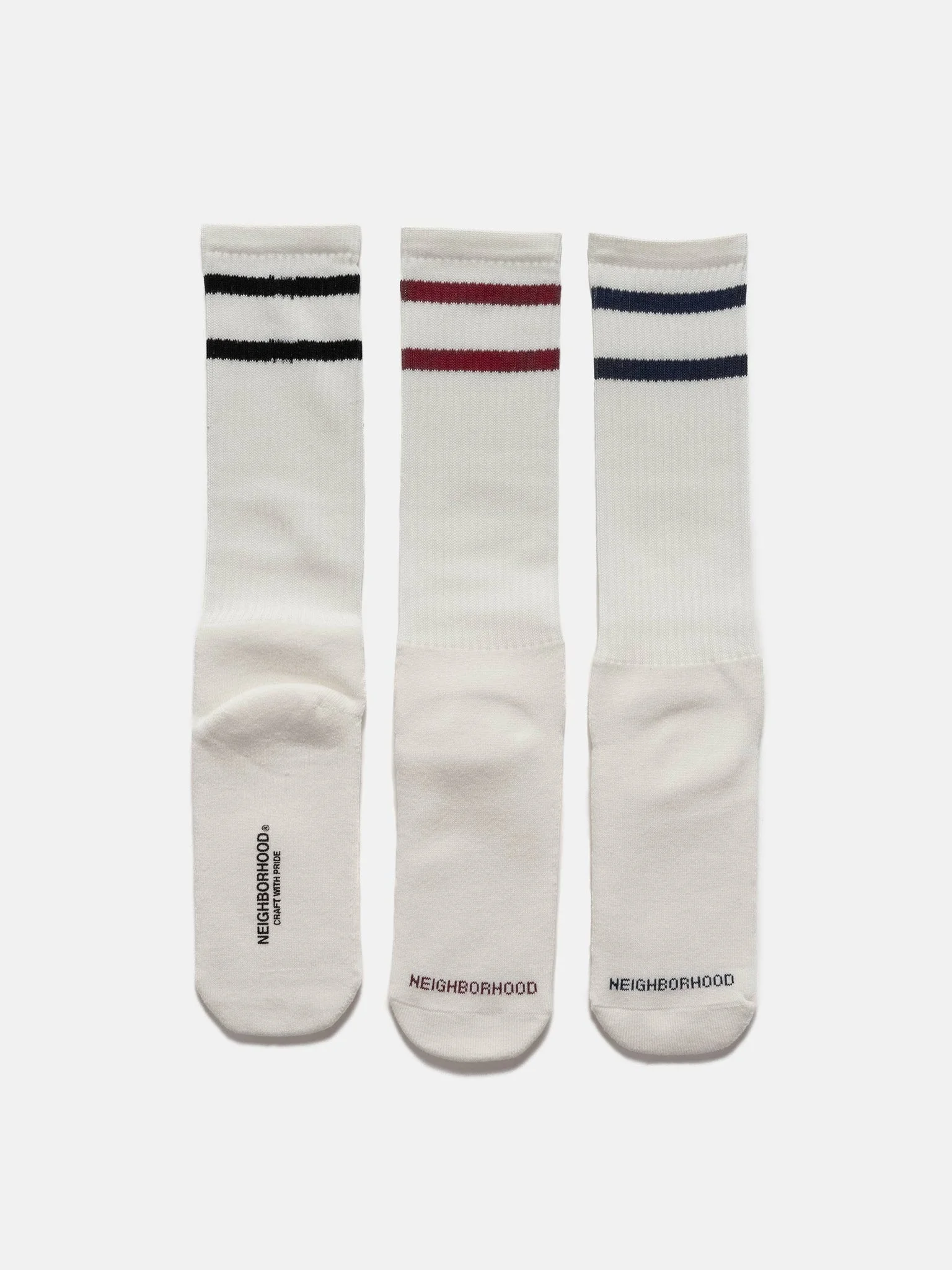 NEIGHBORHOOD Classic 3Pac Socks offer a clean take on retro athletic staples. Knit from a breathable cotton-blend yarn with ribbed cuffs and contrast line detailing, each pair features a jacquard toe logo and printed sole branding. Designed for daily wear, the 3-pack includes three distinct colour accents ideal for pairing with sneakers or low boots. DETAILS - 252KWNH-UWM01 - 60% Cotton, 25% Acrylic, 10% Nylon, 4% Polyester, 1% Polyurethane - Crew length - Cotton-blend rib knit - Jacquard logo at toe - Printed logo at sole - Contrast line detailing - Set of 3 - Made in Japan