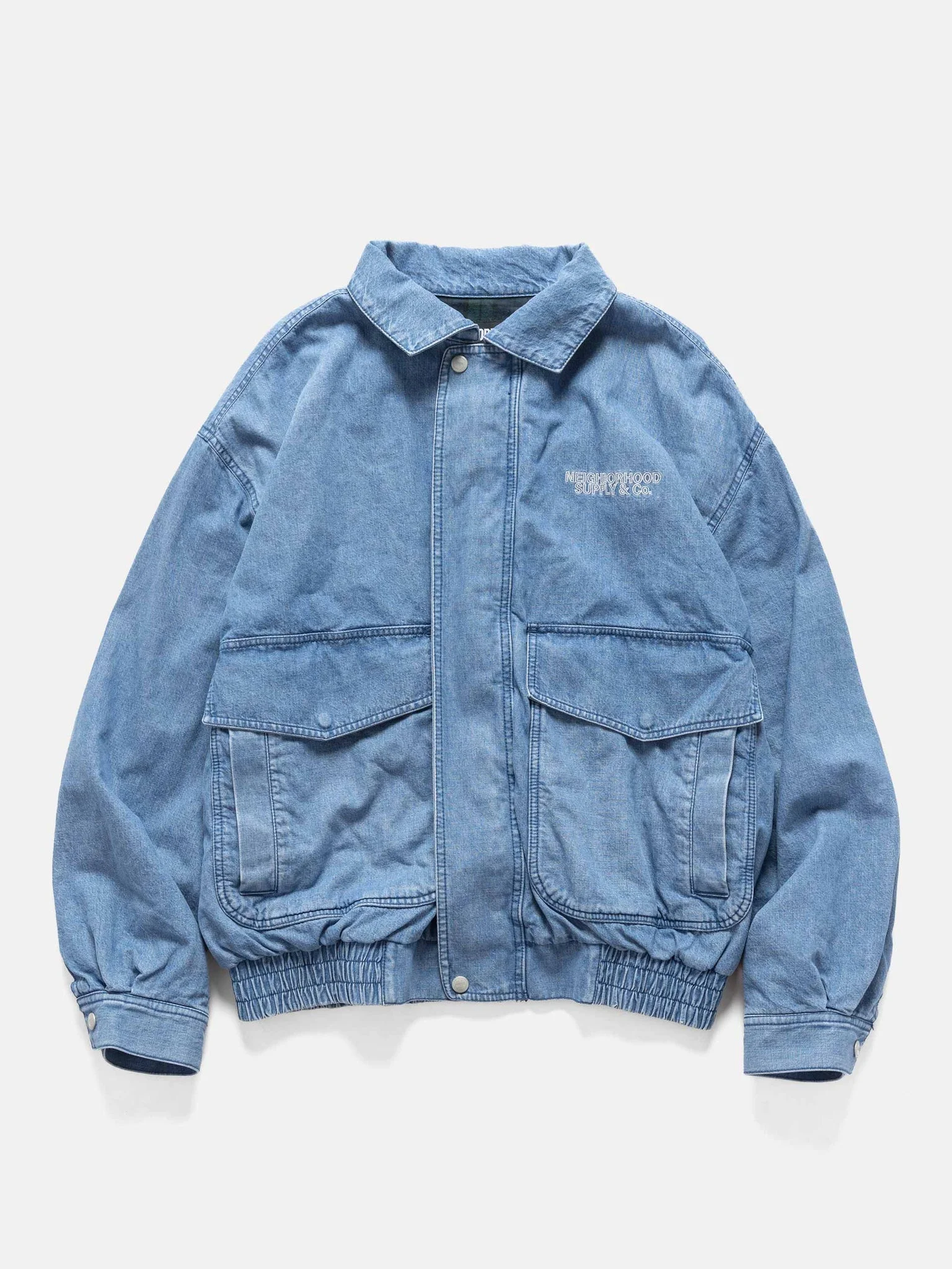 The NEIGHBORHOOD Denim Dad Jacket is a relaxed blouson crafted from 10oz slub yarn denim with a soft hand and rich, textured character. Faded to emulate natural wear, it’s lined with warm flannel for comfort and ease. Dual-entry flap pockets, an elasticated hem, and snap-and-zip front closure add functional appeal. Finished with subtle logo embroidery at the chest for a signature touch. DETAILS - 252SPNH-JKM01 - Body: 100% Cotton - 10oz slub yarn denim - Flannel lining - Relaxed fit - Wash and fade treatment - Zip closure with snap placket - Custom engraved hardware - Flap closure patch pockets with dual entry - Interior chest pocket - Elasticated hem - Snap cuffs - Embroidered design at chest - Woven label at side seam - Made in Japan
