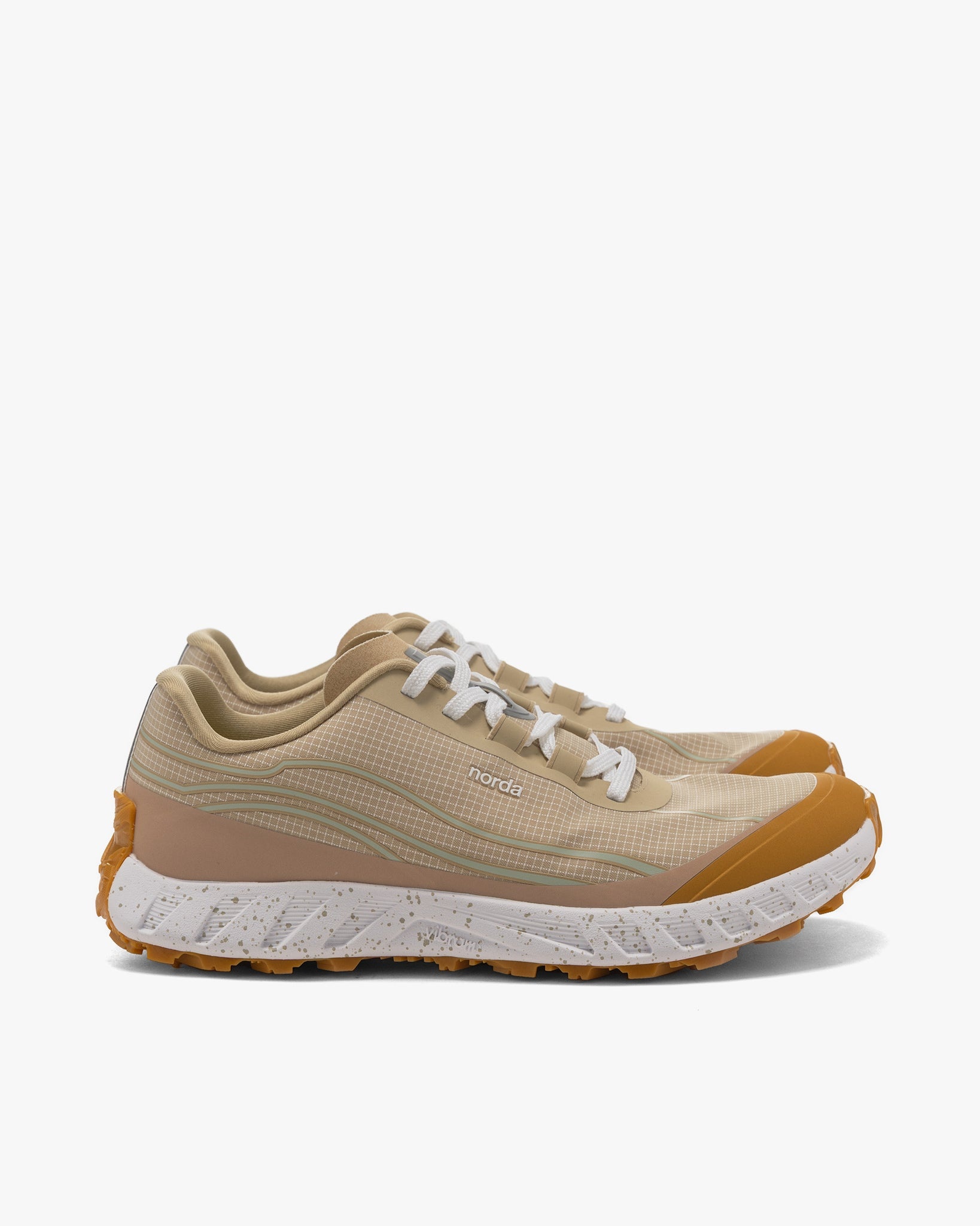 norda's most responsive trail running shoe for technical terrain made with bio-based Dyneema®. A lower stack height provides increased ground feel and heightens your connection to the earth. A padded heel collar and pyramidal midsole geometry promotes confident footing in technical environments, allowing you to reach new heights. DETAILS - NORDA002G-M - Bio-based Dyneema® woven upper - Bio-based Dyneema® and recycled polyester laces - Hi-Vis Reflective - norda™ Lock System - Ultra light and comfortable sock - Gusset construction - Custom designed eTPU insole - norda™ x Vibram® SLE midsole - norda™ x Vibram® exclusive design Formation sole with Litebase® and Megagrip® Rubber. 5mm lugs - Included carry bag
