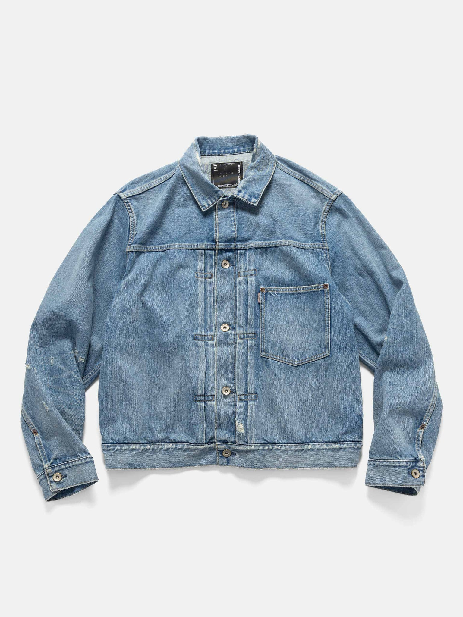 The sacai BEYONDEXX Denim Jacket offers a timeless take on the Type-1 trucker, elevated with expert Japanese craftsmanship. Cut from premium BEYONDEXX denim, it’s distressed with fading, whiskering, and subtle wear for an authentically vintage character. Pleated details, camel topstitching, and silver-tone hardware reinforce its classic heritage, while a buckled back tab lets you customize the fit. A piece that balances sacai’s modern sensibility with the enduring spirit of traditional Americana. DETAILS - 25-03774M - 100% Cotton - BEYONDEXX denim - Vintage wash and distress treatment - Relaxed, boxy fit - Point collar - Rivet buttons throughout - Button closure - Pleated front - Patch chest pocket - Buttoned barrel cuffs - Adjustable back cinch - Logo-engraved hardware - Made in Japan