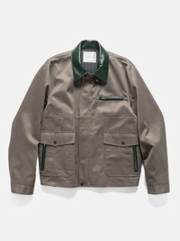 The sacai Cotton Chino Blouson offers a refined take on utilitarian outerwear, blending clean tailoring with subtle contrast details. Constructed from sturdy cotton chino with leather accents, it features a relaxed silhouette and a streamlined front that keeps the look sharp yet understated. Thoughtful pocket placement and restrained sacai touches give the piece everyday versatility with a quietly elevated feel. DETAILS - 26-03908M - Body: 100% Cotton - Parts: 100% Cowhide - Liner: 100% Cupro - Relaxed fit - Leather spread collar - Concealed two-way zipped front - Zippered chest pocket - Zippered hand pockets - Front flap pockets - Zipper expansion panel at cuffs - Adjustable waist tabs - Partially elasticated hem - Made in Japan