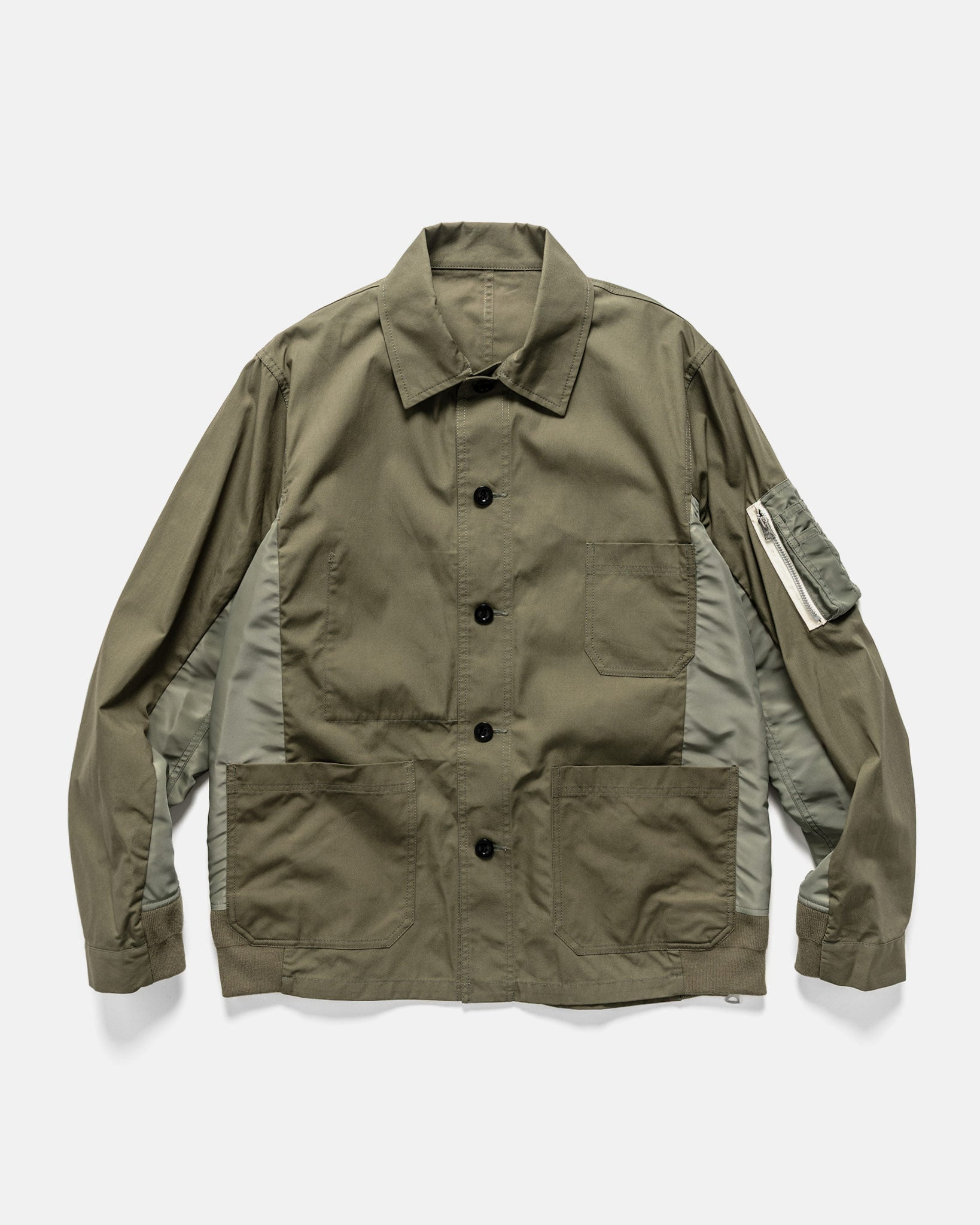 A refined clash of archetypes, this sacai jacket blends the structure of a chore coat with the utility of the MA-1. Cut from cotton oxford with tonal nylon twill paneling at the sides and sleeves, it balances utilitarian design with flight jacket function. Patch pockets and a signature sleeve zip pocket provide everyday utility, while side zip openings allow for adjustable styling. A study in contrasts that feels purposeful and wearable. DETAILS - SCM-245 - Body: 70% Cotton, 30% Polyester - Panels: 100% Nylon - Trims: 55% polyester, 44% cotton, 1% polyurethane - Liner: 100% Polyester - Relaxed fit - Panelled sides and sleeves - Patch chest pocket - Patch hand pockets - Zip sleeve pocket - Button cuffs - Button closure - Made in Japan