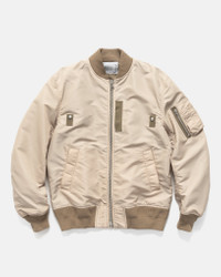 The sacai Nylon Twill Blouson reimagines the classic MA-1 jacket with a refined, modern aesthetic. Crafted from luxurious nylon twill, it features a relaxed fit and elevated performance materials for both style and functionality. Signature sacai details include snap closure split side seams, a two-way zip closure, and ribbed trims, blending tradition with contemporary design. This versatile piece showcases sacai's innovative approach to technical fashion. DETAILS - SCM-201 - Body: 100% nylon - Trims: 55% polyester, 44% cotton, 1% polyurethane - Filling: 100% polyester - Lining: 100% polyester - Relaxed fit - Two-way zip closure - Internal storm flap - Snap closure split side seams - Zipper sleeve pocket - Zipper welted hand pockets - Ribbed hem, collar and cuffs - MA-1 inspired detailing - Made in Japan