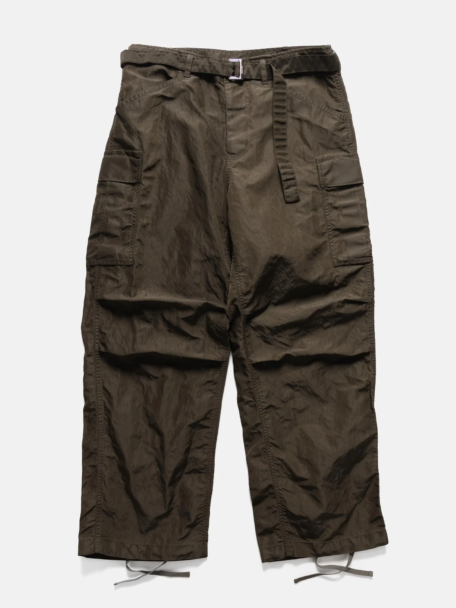 The sacai Treated Nylon Twill Pants reinterpret a classic utilitarian cargo trousers through the brand's refined approach. Crafted from treated nylon twill, they’re cut with a relaxed fit, articulated knees for mobility, and abundant pocket storage for daily essentials. Equally functional and polished, they’re ideal for both everyday wear and more considered outfits. DETAILS - 26-03915M - 100% Nylon - Relaxed, straight fit - High waisted - Integrated waist belt - Front zip fly - Front welt hand pockets - Cargo pockets with straps - Back flap pockets - Articulated knees - Made in Japan