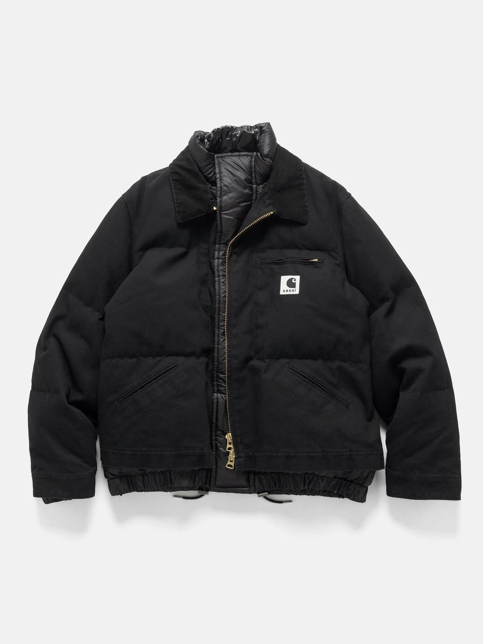 The sacai x Carhartt WIP Washed Duck Puffer Jacket fuses Carhartt WIP’s Detroit Jacket with sacai’s puffer jacket as an insulated lining, attached through classic down jacket stitching. The Detroit Jacket layer is made from Carhartt WIP’s cotton duck canvas, which has been garment-washed for a unique, worn-in appearance. The puffer layer, meanwhile, is made from high-density nylon taffeta, which has been woven with water-repellent threads for airtight protection. The puffer is also filled with down. A co-branded woven label appears on the chest pocket. DETAILS - #25-03858M - Body: 100% Cotton - Parts 1: 100% Nylon - Parts 2: 80% Cotton, 20% Polyester - Liner 1: 100% Cupro - Liner 2: 100% Nylon - Fill 1: 100% Polyester - Fill 2: 90% Down, 10% Feather - Garment-washed - Co-branded woven label - Made in Japan