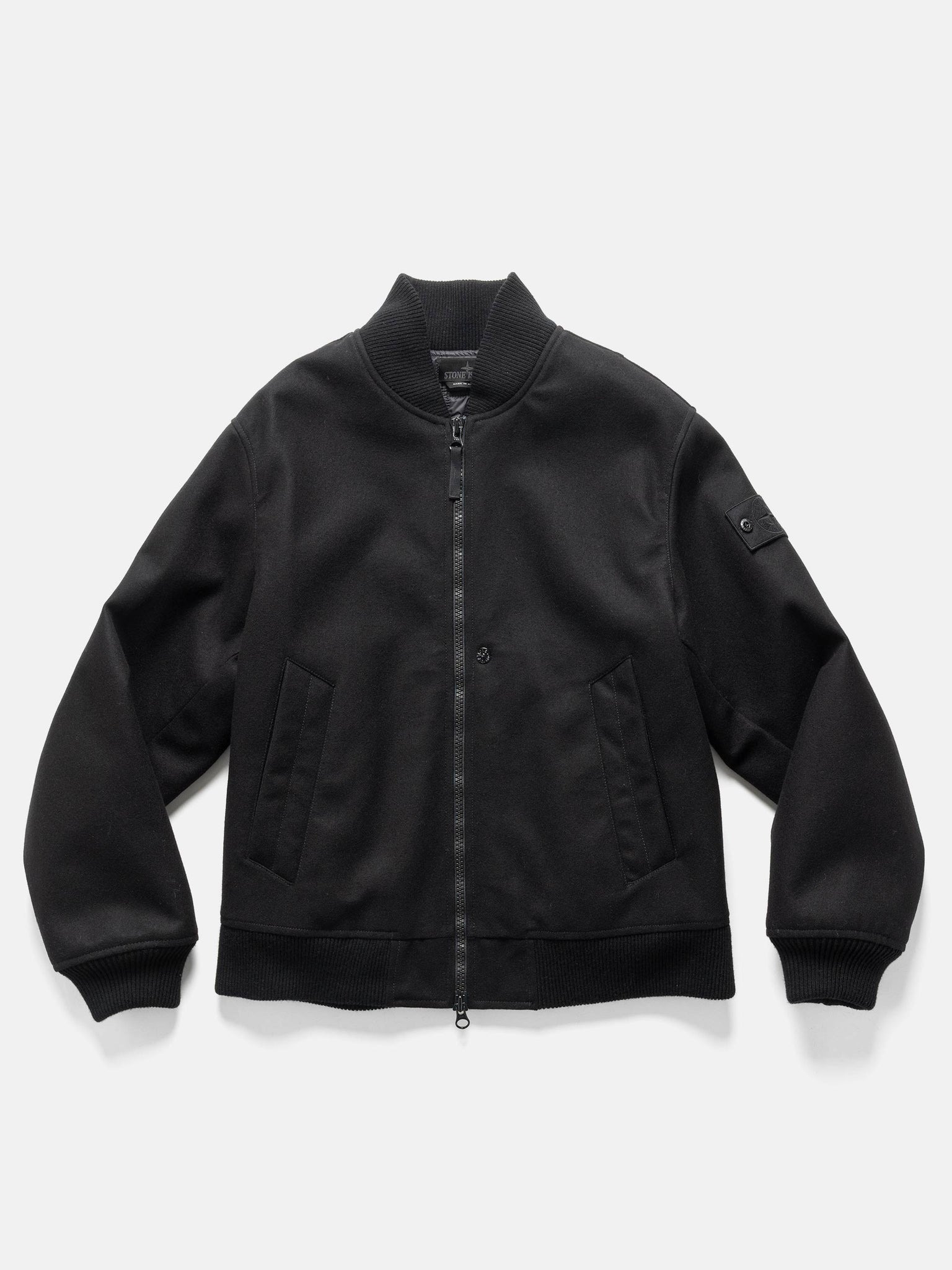 The Stone Island Ghost Piece Wind Resistant Wool Bomber blends minimalism with technical performance. Made from lightweight wool-nylon flannel with a PrimaLoft® quilted lining and breathable membrane, it protects from wind and light rain. Shaping darts, ribbed collar, cuffs, and hem ensure a refined fit, while pockets and a two-way zipper add practical functionality. Monochromatic Ghost details, including the tonal badge, deliver a clean, understated look. DETAILS - 4100102 S0F18 - Body: 77% Wool, 23% Polyamide - Lining: 100% Polyamide - Padding: 100% Polyester - PrimaLoft® insulation - Anti-drop treatment - Wind resistant, water resistant, breathable - Regular fit - Ribbed bomber collar - Slanted hand pockets with concealed snap - Inner pocket with button - Shaping darts on back shoulders - Two-way zipper fastening - Ribbed cuffs and hem - Stone Island Ghost badge on left sleeve - Made in Albania