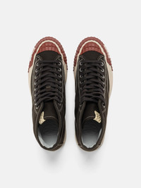 The visvim Skagway Hi Alta reimagines classic court shoes with an elevated, artisan-made silhouette and unmistakable visvim detailing. The upper is crafted from durable duck cloth woven with Aspero cotton—hand-harvested in Peru—giving the shoe a natural texture and depth. Lightly marbled taping and hand-distressed finishing create a lived-in character from day one, while leather lining and a vulcanized toe add comfort and longevity. Completed with custom rubber soles and tonal stitching, it’s a refined, vintage-inspired sneaker built with exceptional craft. DETAILS - 0125201001003 - Premium duck fabric upper - Aspero cotton canvas - Pigment free cowhide leather lining and insole - Hand painted and distressed sole - Cork midsole - Custom rubberised outsole - Vulcanized toebox - Stitched heel plate - Hand painted tongue tab - Metal eyelets - Washed finish