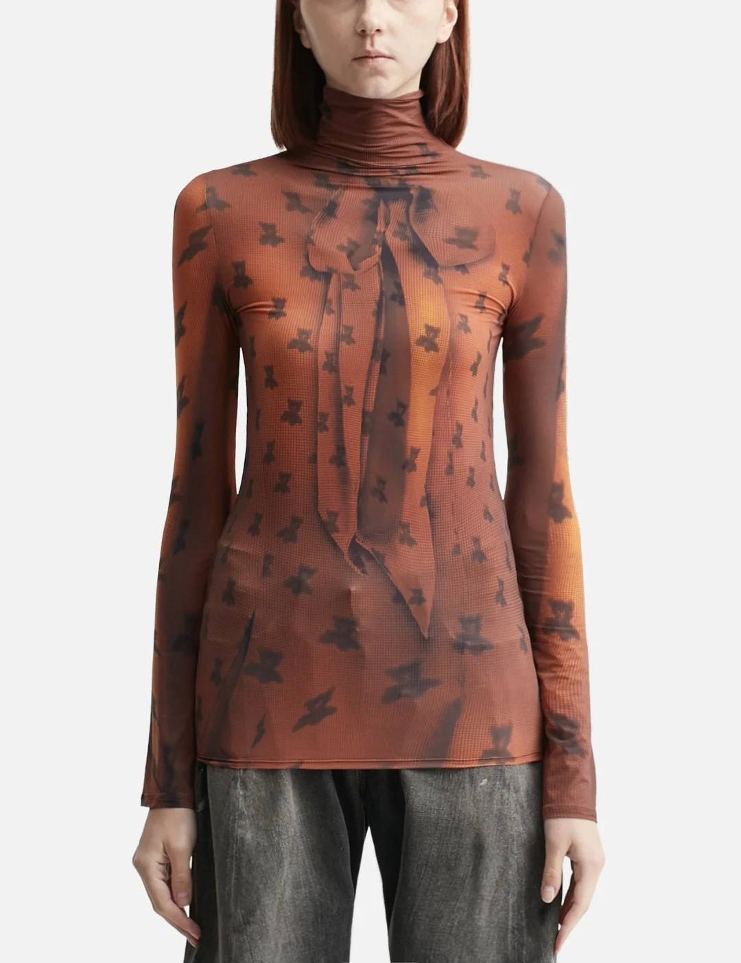 - Acne Studios - Fitted Print T-shirt - Made of lightweight mesh - Fitted style - Funnel neck - Long-sleeve - Seasonal trompe l’œil print - Color: Rust Brown - Material: 20% Elastane, 80% Nylon - See more LS T-Shirts, T-Shirts and Clothing - Model wears size XS - Model measures: Height 177cm, Chest 32”/81cm, Waist 23.5”/59.7cm, Hip 33’’/83.8cm - Vendor Code: FN-WN-TSHI000805