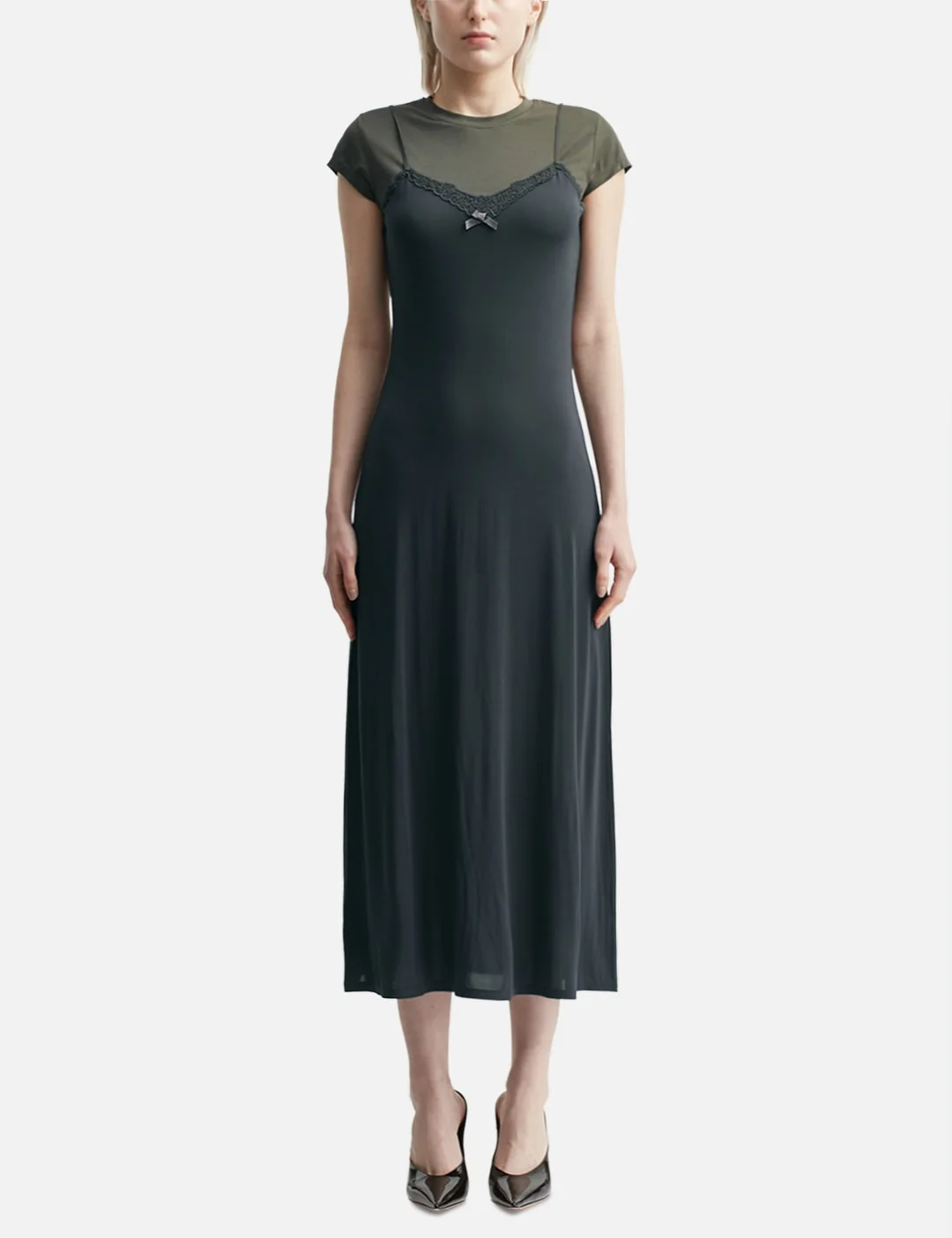 - Acne Studios - Layered Jersey Dress - Layered design - T-shirt with a strap dress overlay - Lace and bow detail on the center - Mid-length - Color: Gray/Anthracite - Material: Fabric 1: 93% Viscose, 7% Elastane; Fabric 2: 90% Organic Cotton, 10% Elastane - See more Dresses and Clothing - Model wears size S - Model measures: Height 177cm, Chest 31.9’’/81cm, Waist 23.6’’/60cm, Hip 35.8’’/91cm - Vendor Code: FN-WN-DRES001472