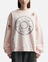- Acne Studios - Logo Print Distressed Sweater - Dropped shoulders - Distressed details throughout - Logo print at front - Ribbed collar, cuffs, and hem - Color: Faded Pink - Material: 85% Cotton, 15% Polyester - See more Sweatshirts and Clothing SIZING - Model wears size S - Model measures: Height 177cm, Chest 32"/81cm, Waist 23.5"/59.7cm, Hip 33’’/83.8cm