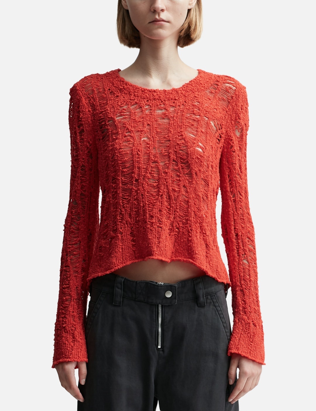 - Acne Studios - Loose Knit Sweater - Regular fit - Ribbed crewneck - Extra long sleeves - Loose knit - Hip length - Color: Red - Material: 88% Cotton, 12% Nylon - See more Knitwear and Clothing SIZING - Model wears size S - Model measures: Height 179cm, Chest 32”/81cm, Waist 23’’/58.42cm, Hip 35’’/88.9cm