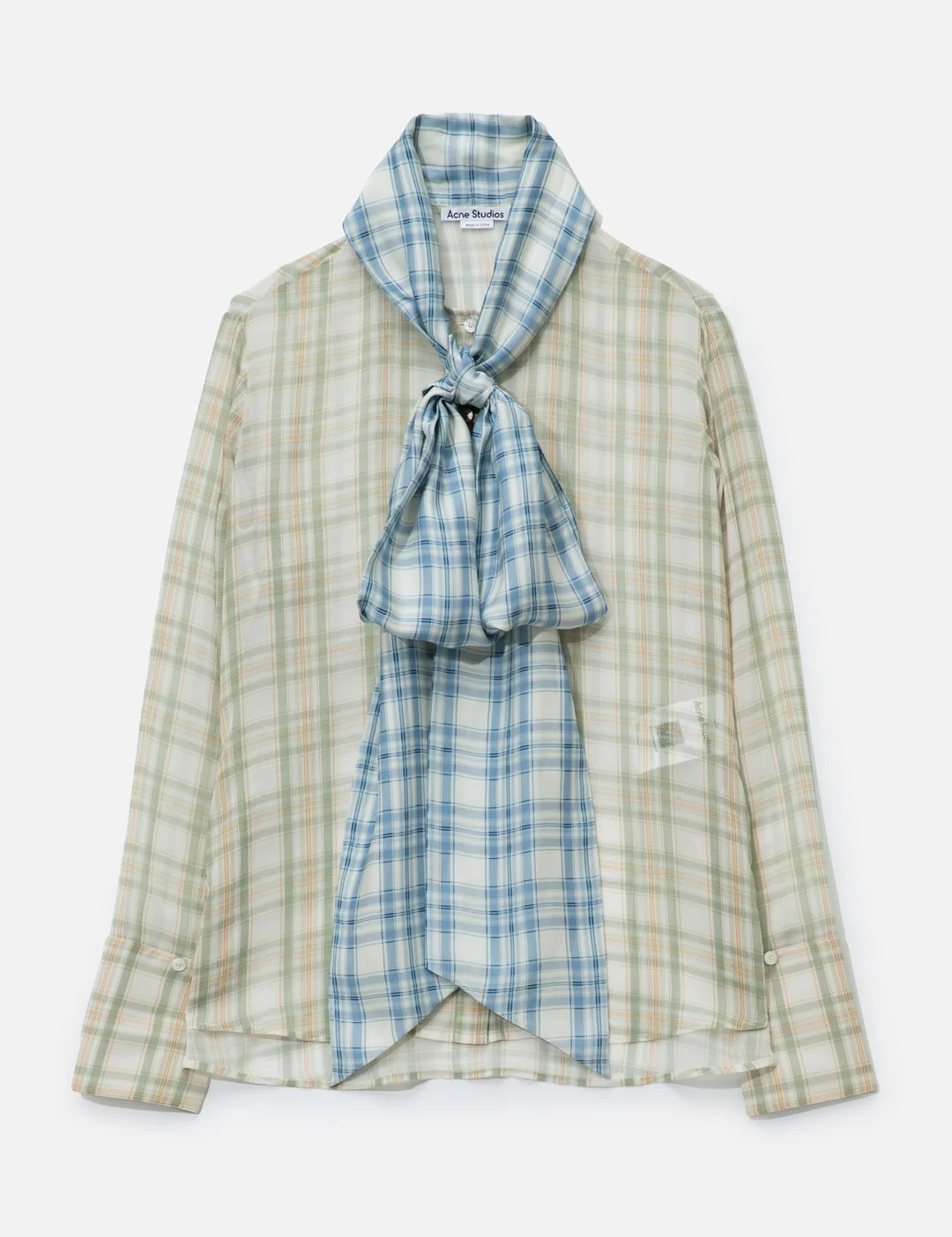 - Acne Studios - Silk Blouse With Scarf - Made of textured silk fabric - Regular-fit - Hip length - Scarf attached at collar - Long sleeves - Seasonal check print - Branded button front closure - Detachable cuffs - Rounded hem with slits - Color: Green/ Orange - Material: 100% Silk; Contrast: 100% Cupro - See more Shirts and Clothing - Model wears size 34 - Model measures: Height 179cm, Chest 31’’/79cm, Waist 24’’/61cm, Hip 36.4’’/92.5cm - Vendor Code: RW-WN-BLOU000002