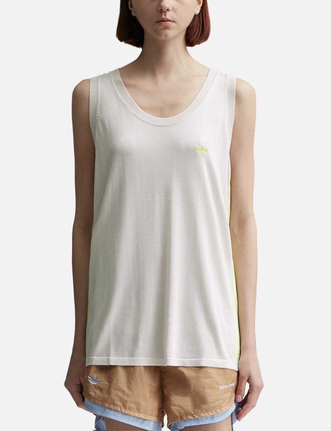 - Adidas Originals - Wales Bonner Knit Vest - Adidas Originals x Wales Bonner collaborative collection - Regular fit - Ripped round neckline - 3-Stripes along the sides - Branding at chest and at rear - Color: Chalk White / Semi Frozen Yellow - Material: 67% Viscose, 33% Polyester (Recycled) - See more Knitwear and Clothing SIZING Men - Model wears size L - Model measures: Height 186cm, Chest 35”/89cm, Waist 30.5”/78cm, Hip 35.5”/91cm - Model wears size S - Model measures: Height 177cm, Chest 32”/81cm, Waist 23.5”/59.7cm, Hip 33’’/83.8cm