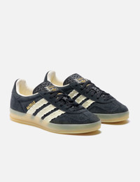 - adidas Originals - Gazelle Indoor - Textile upper with leather overlays - Lace-up closure - Ruffled 3-Stripes - Synthetic lining - Translucent wraparound synthetic outsole - Color: Core Black / Cream White / Gum - Material: Textile, Leather, Synthetic - See more Sneakers and Shoes - Vendor Code: JS1412