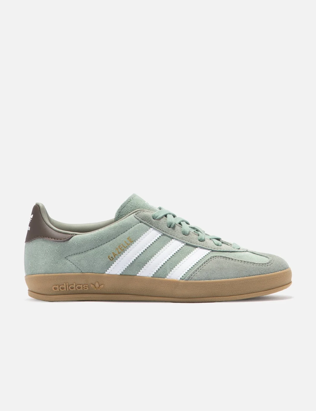 - adidas Originals - Gazelle Indoor - Textile upper with suede overlays - Lace-up closure - Branding at side - Translucent wraparound gum outsole - Color: Silver Pebble/Silver Green/FTWR White - Material: Textile, Suede, Rubber - See more Sneakers and Shoes - Vendor Code: JI3526