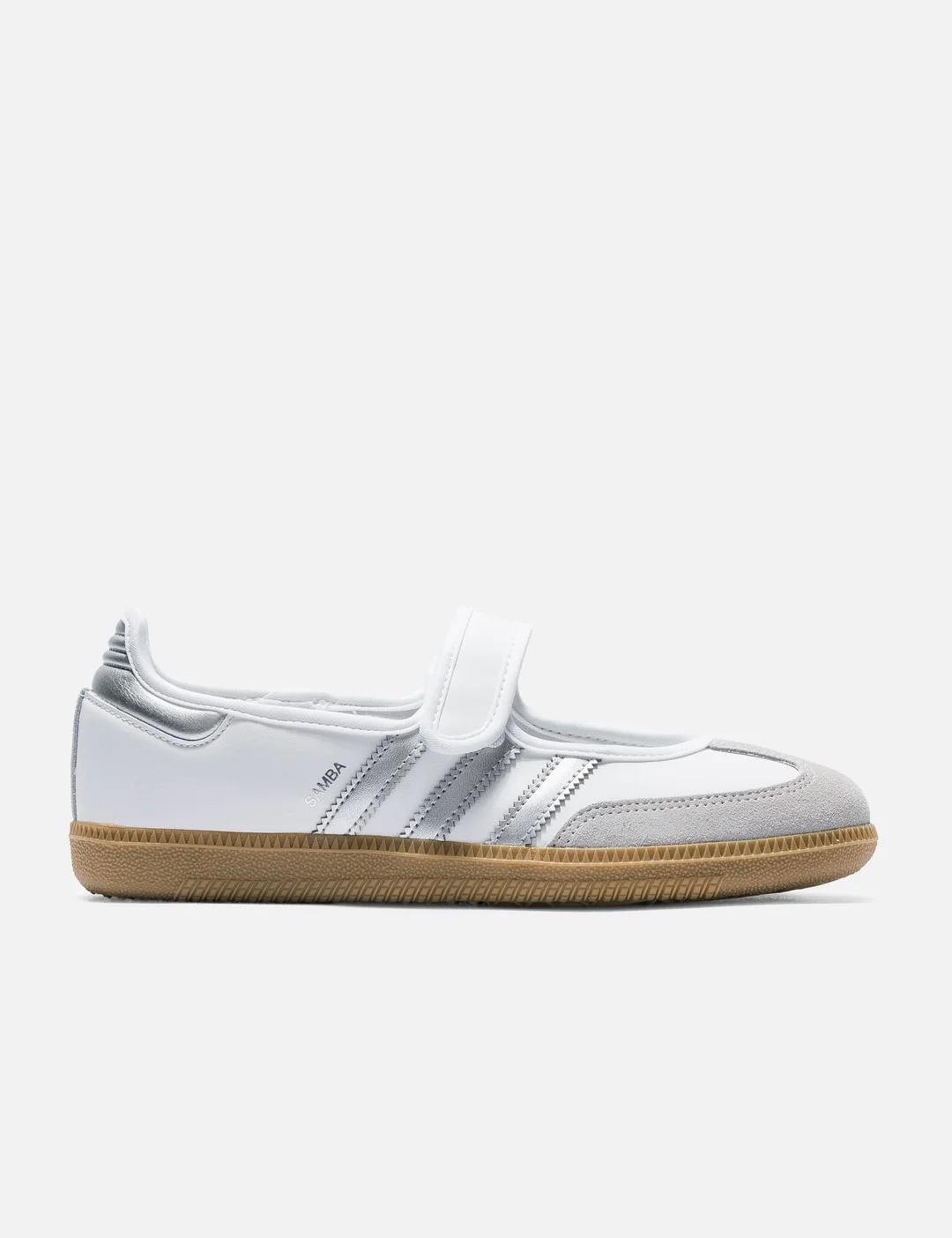 - adidas Originals - Samba Jane - Low-profile - Smooth leather upper with suede toe - Velcro strap closure - Signature serrated 3-Stripes - Smooth satin lining - Rubber outsole - Color: Cloud White / Silver Metallic / Gum - Material: Leather, Textile, Rubber - See more Sneakers and Shoes - Vendor Code: KJ3785