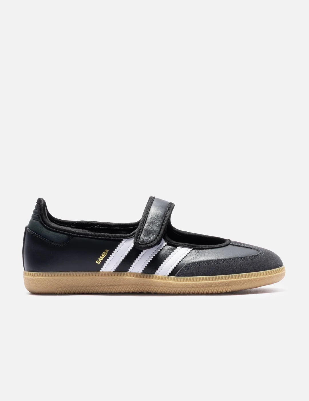 - adidas Originals - Samba Jane - Low-profile - Smooth leather upper - Velcro strap closure - Signature serrated 3-Stripes - Smooth satin lining - Rubber outsole - Color: Cloud White / Carbon / Core Black - Material: Leather, Rubber - See more Sneakers and Shoes - Vendor Code: JQ6445